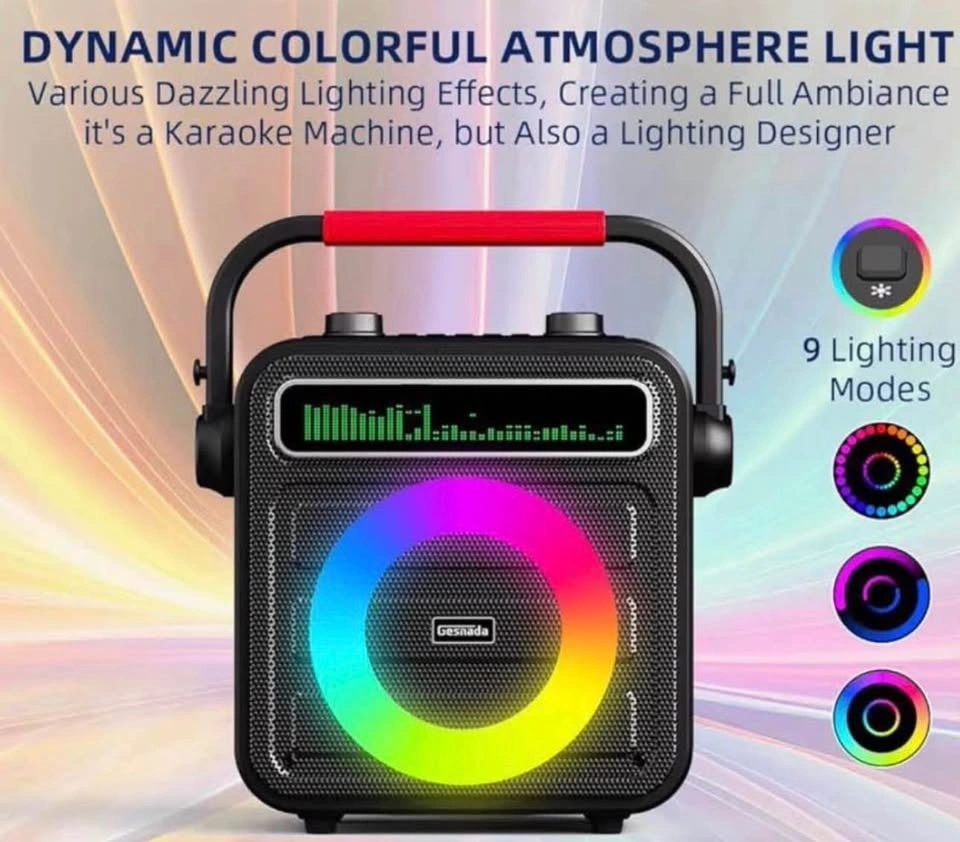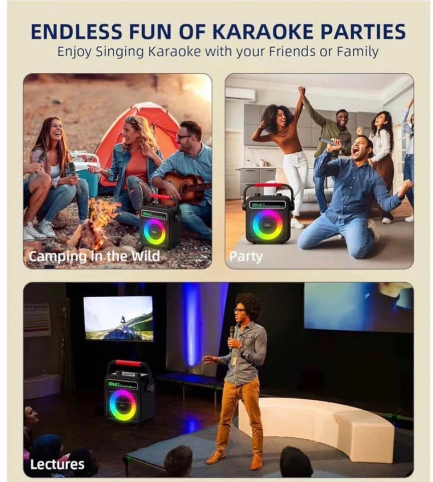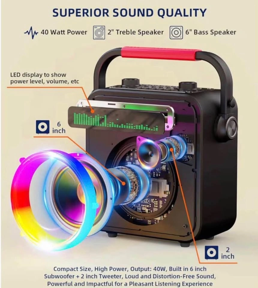 Portable Bluetooth Speaker with PA System for Adults & Kids. Features LED Lights, Bass/Treble Adjustment, and supports REC/TWS/FM/AUX/USB/IF Card. Great for parties!