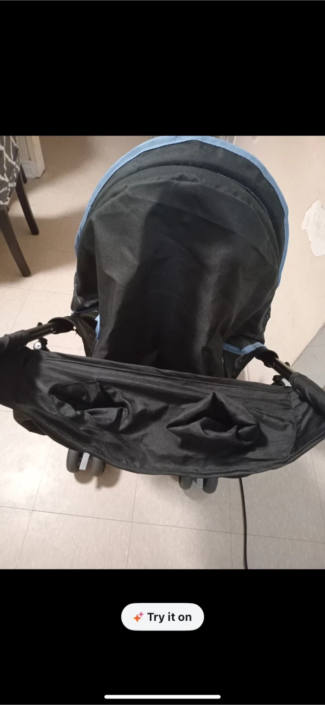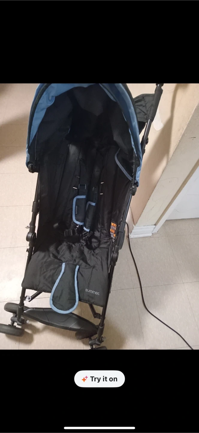 This is a Summer Infant stroller with a black and blue design. It's lightweight and foldable for easy transport. The stroller has a 5-point harness for safety. This would be handy for parents on the go!