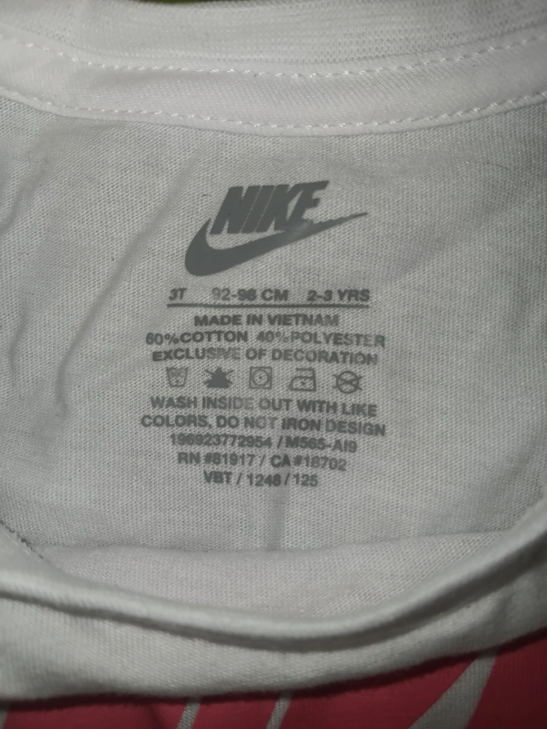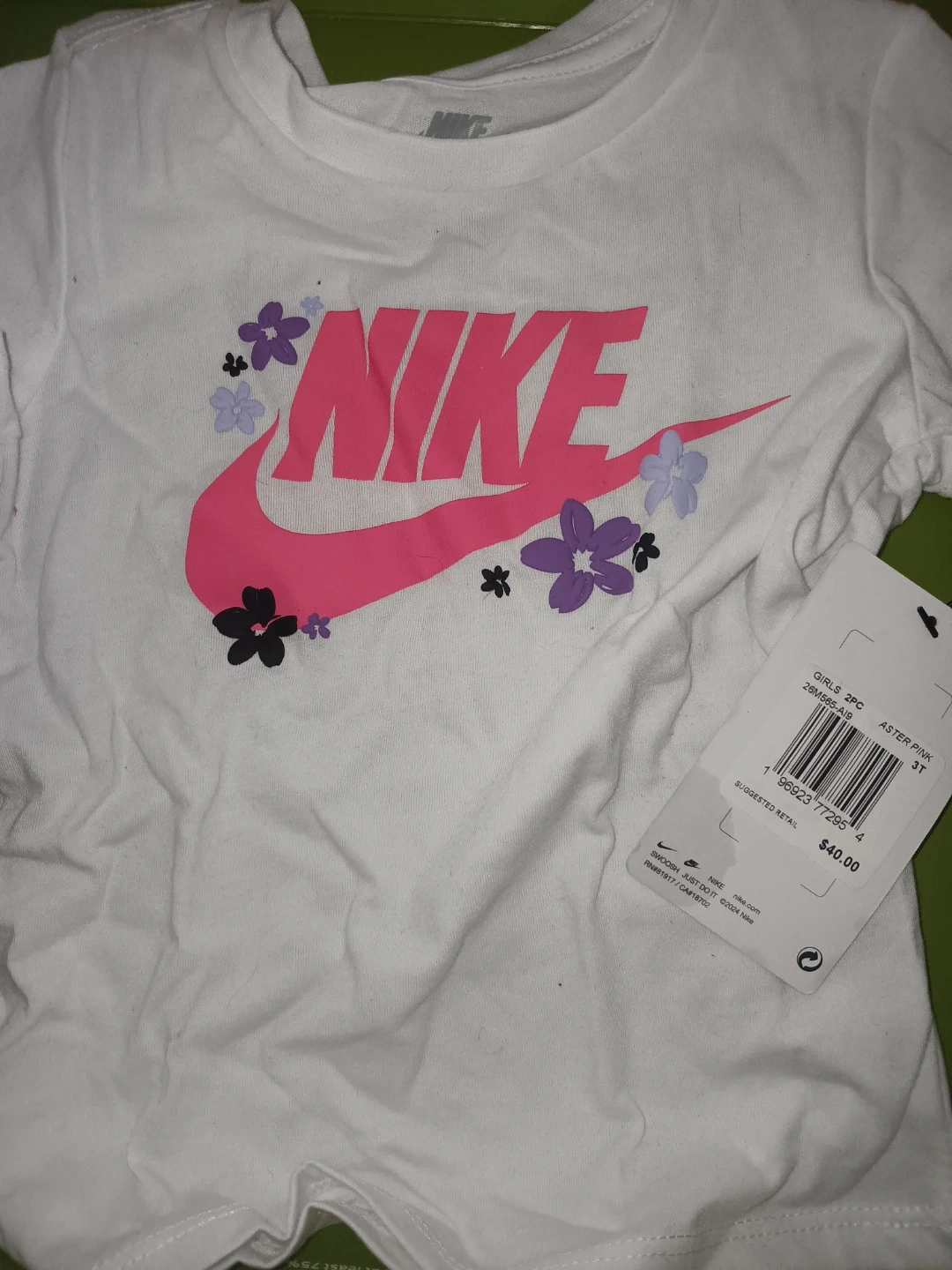 This is a white Nike t-shirt for girls. It's size 3T and made from 60% cotton and 40% polyester. The shirt features the Nike logo with floral accents.