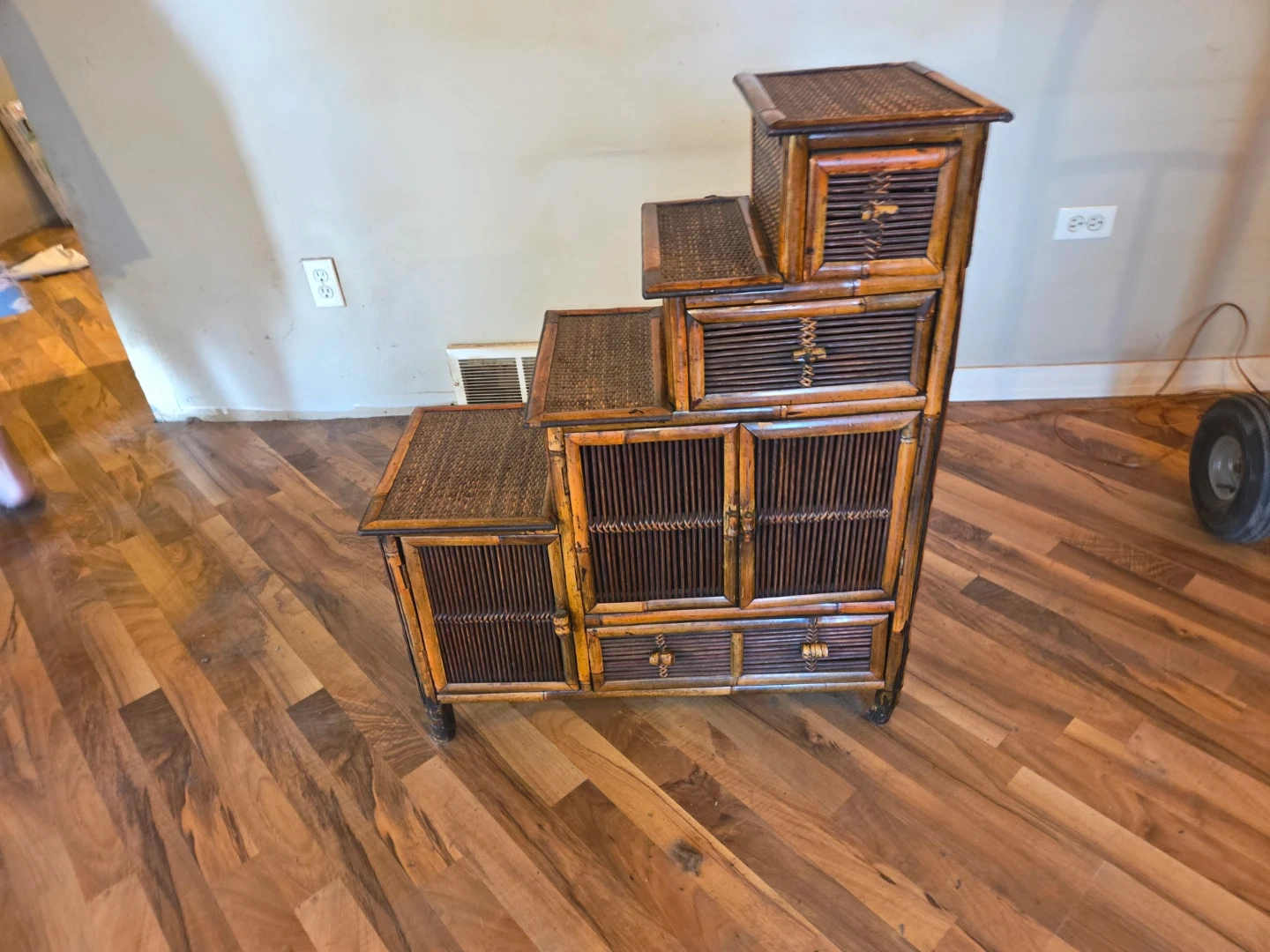 Tiered storage cabinet made from bamboo. It features multiple drawers and cabinets for ample storage. This unique piece adds a natural touch to any room!