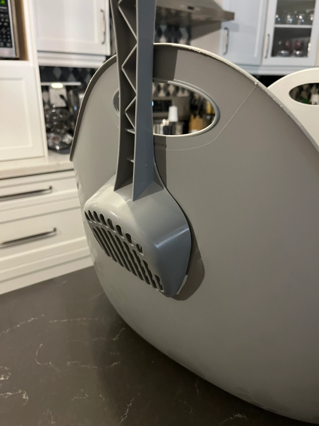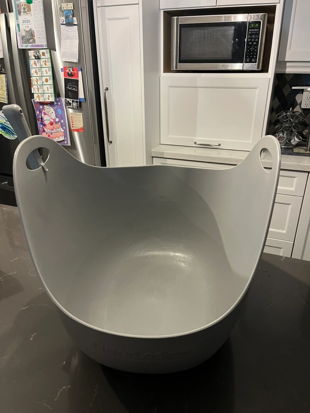 Large high sided gray plastic litter box with carry handles for easy disposal. Includes matching scoop. Fastest pick up please.