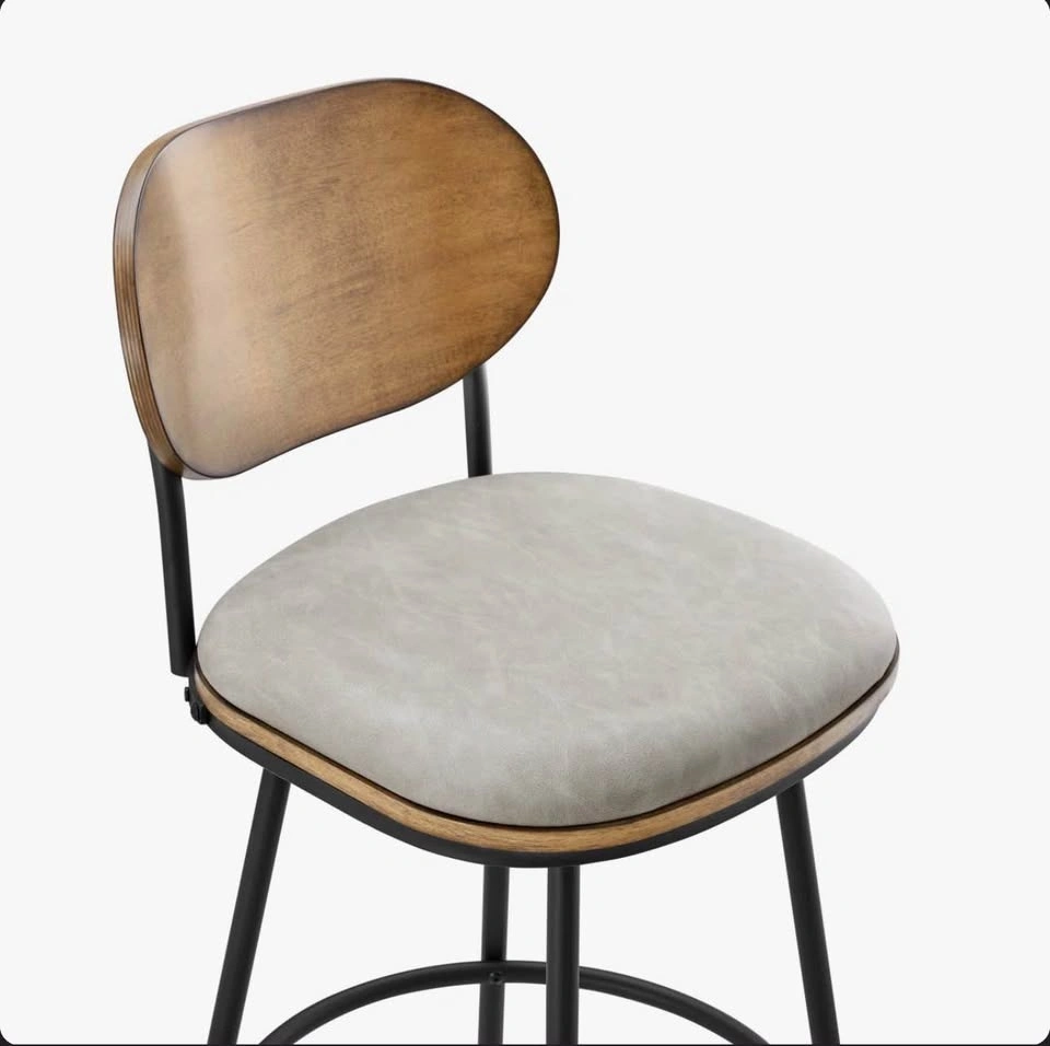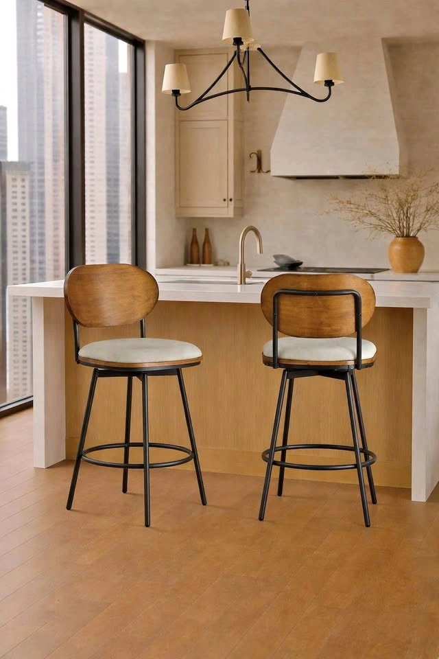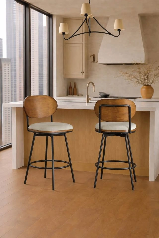 Upgrade your kitchen island or counter with this stylish set of 2 counter-height stools featuring a warm Kiln wood back, cushioned upholstered seat, and sleek black metal frame. The design is modern yet timeless—perfect for condos, townhomes, or modern kitchens.