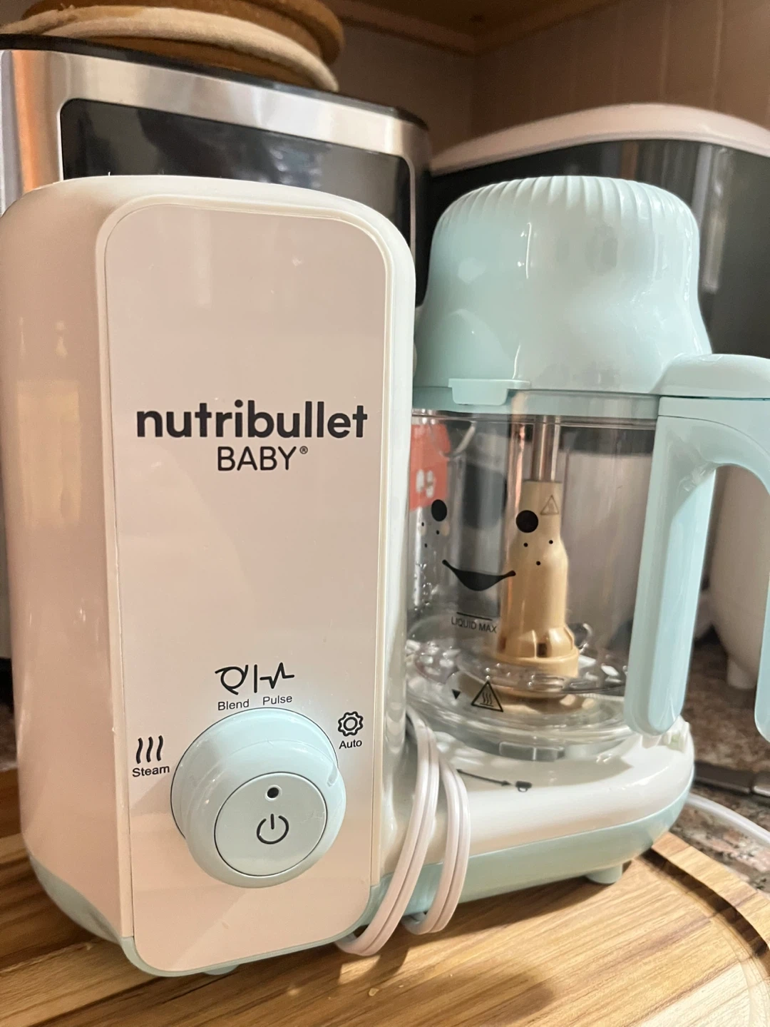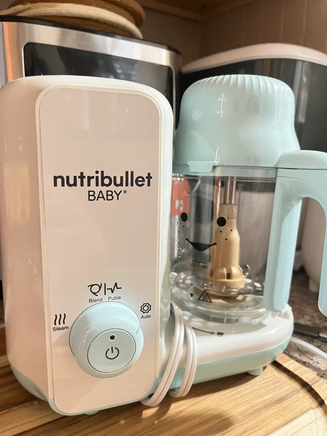 This NutriBullet Baby steams and blends homemade baby food. It features a water reservoir for steaming and a blending container. It has settings for steam, blend, pulse, and auto functions.