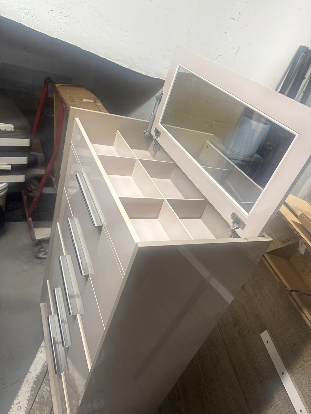 This beige jewelry organizer features multiple compartments for storing various accessories. It has a mirrored lid that opens to reveal the divided storage sections. The organizer is made of a smooth, glossy material with silver-tone handles. Its design is sleek and modern.