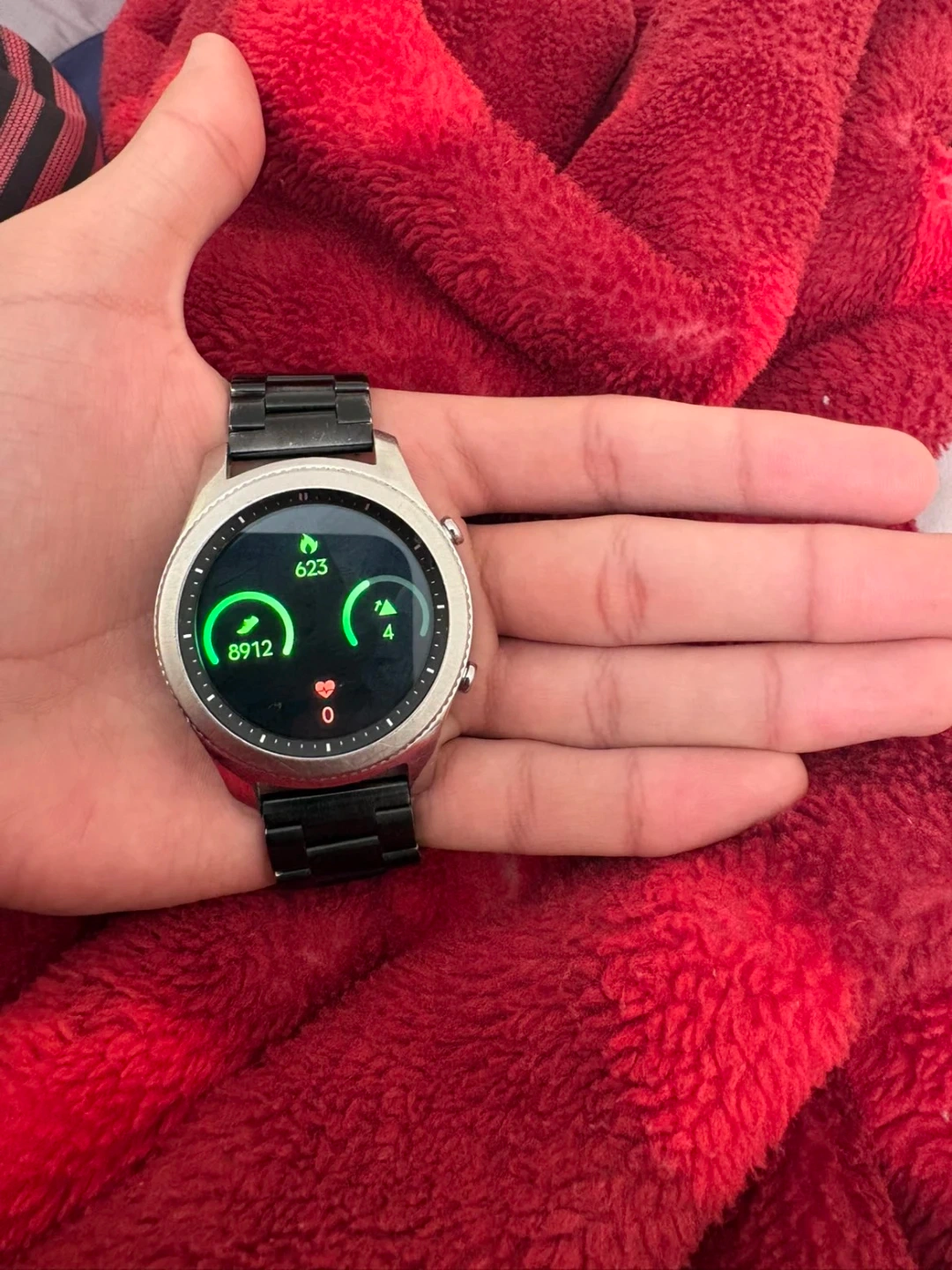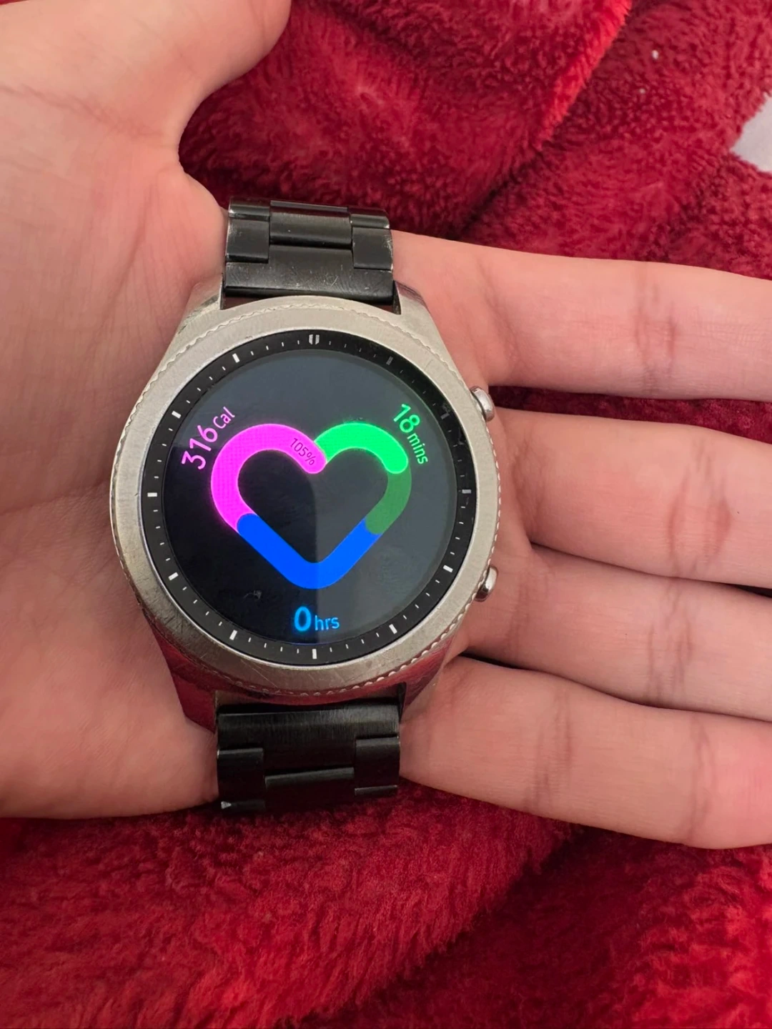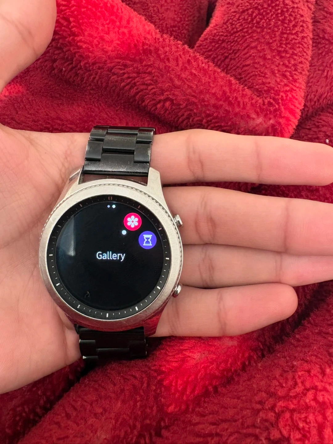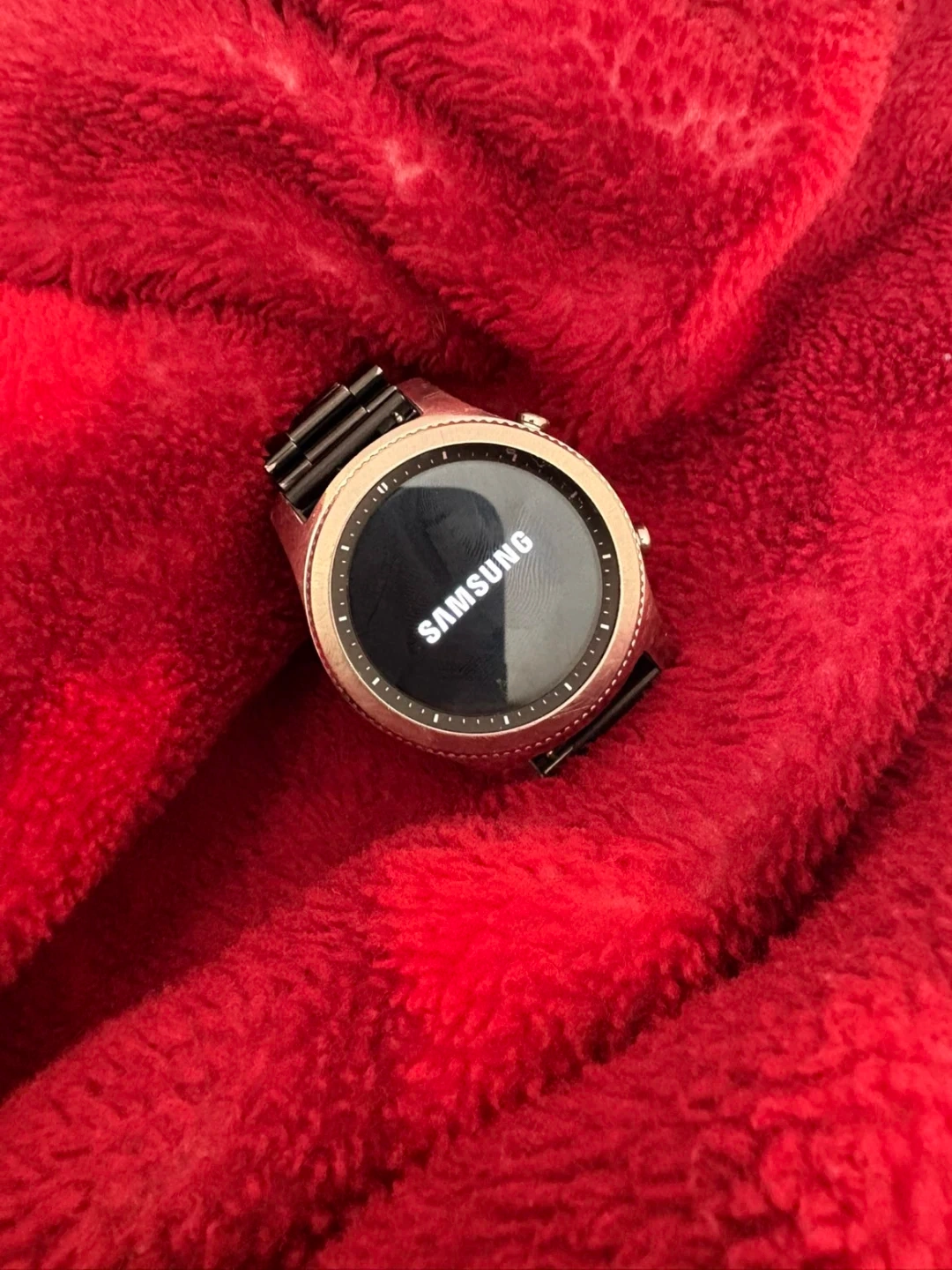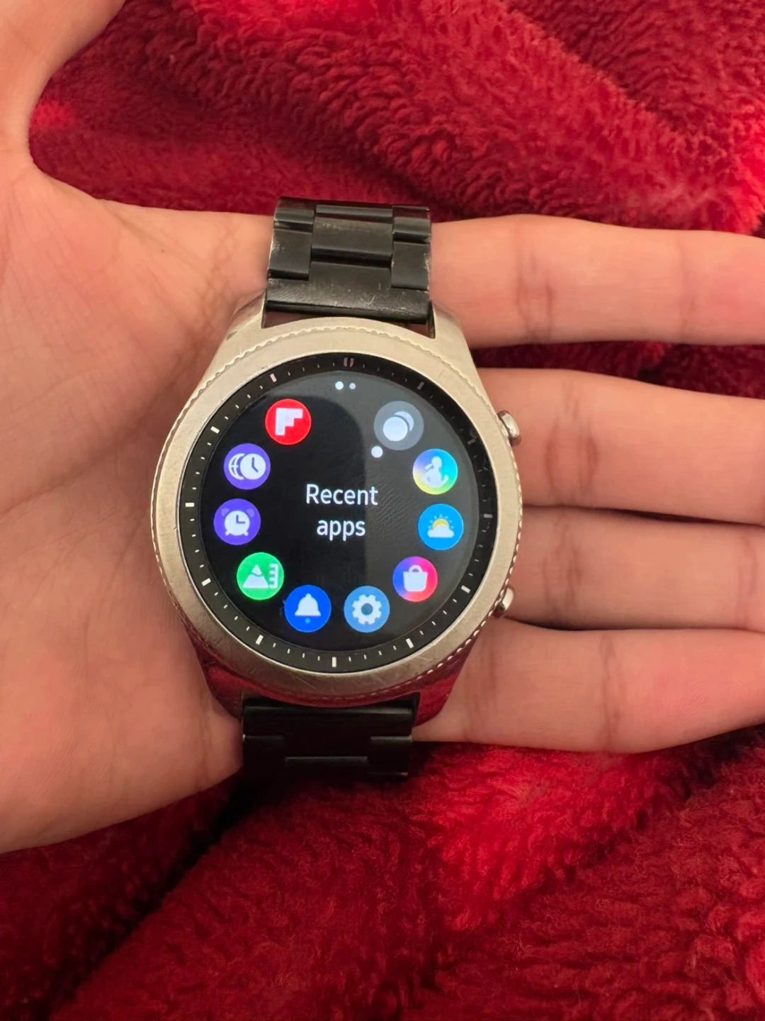 Selling a silver Samsung smartwatch with a black metal band. It displays recent apps and activity tracking like steps and calories. This watch is great for staying connected and monitoring your fitness goals. It supports various apps and functions. And it comes with a charger to.