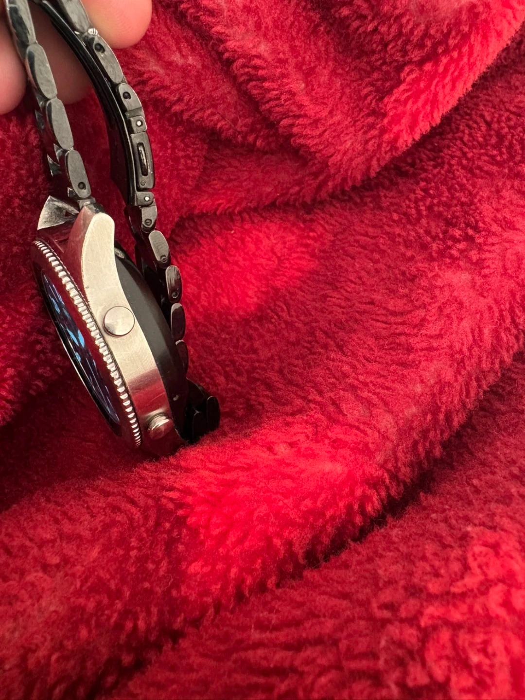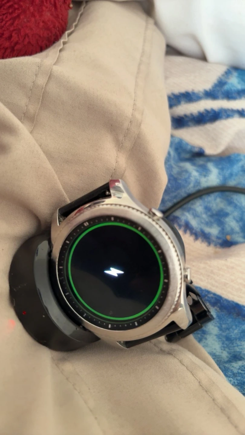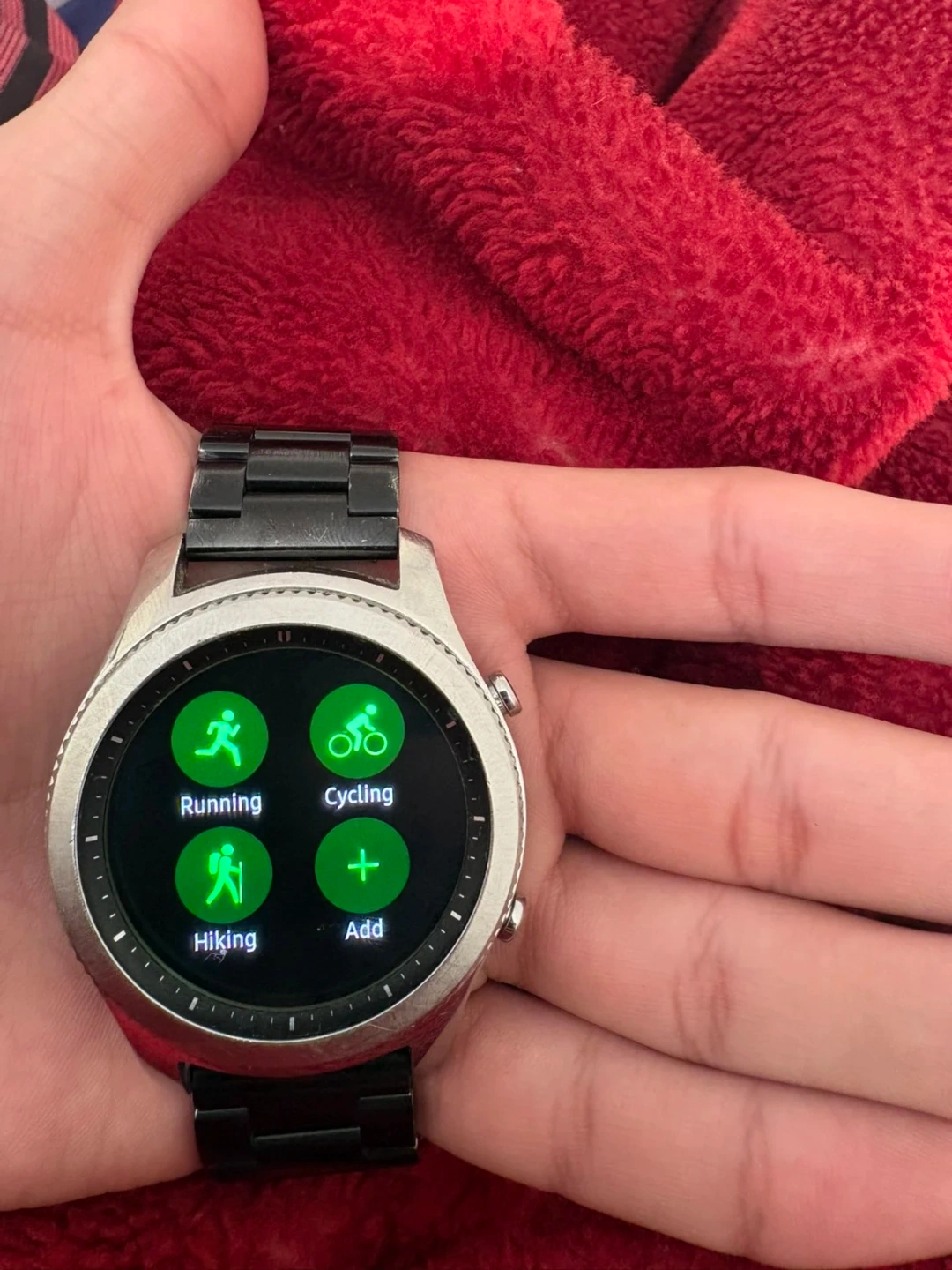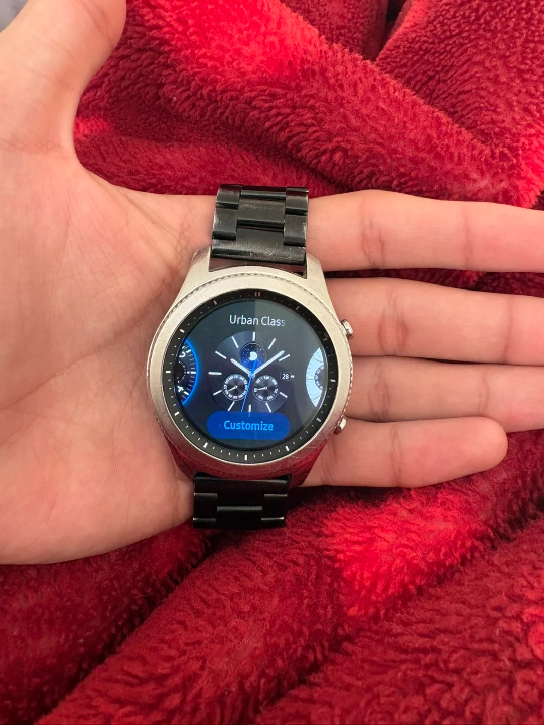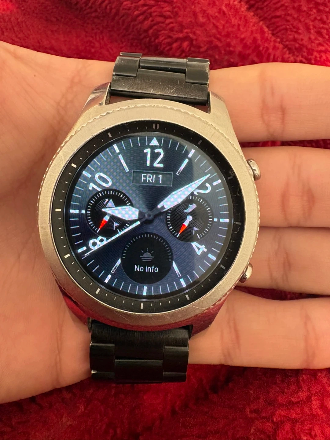 Selling a silver Samsung smartwatch with a black metal band. It displays recent apps and activity tracking like steps and calories. This watch is great for staying connected and monitoring your fitness goals. It supports various apps and functions. And it comes with a charger to.