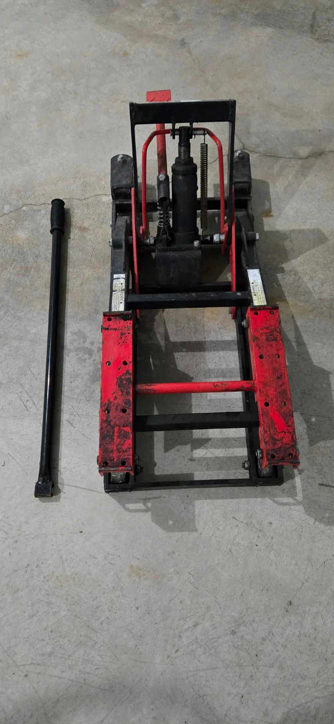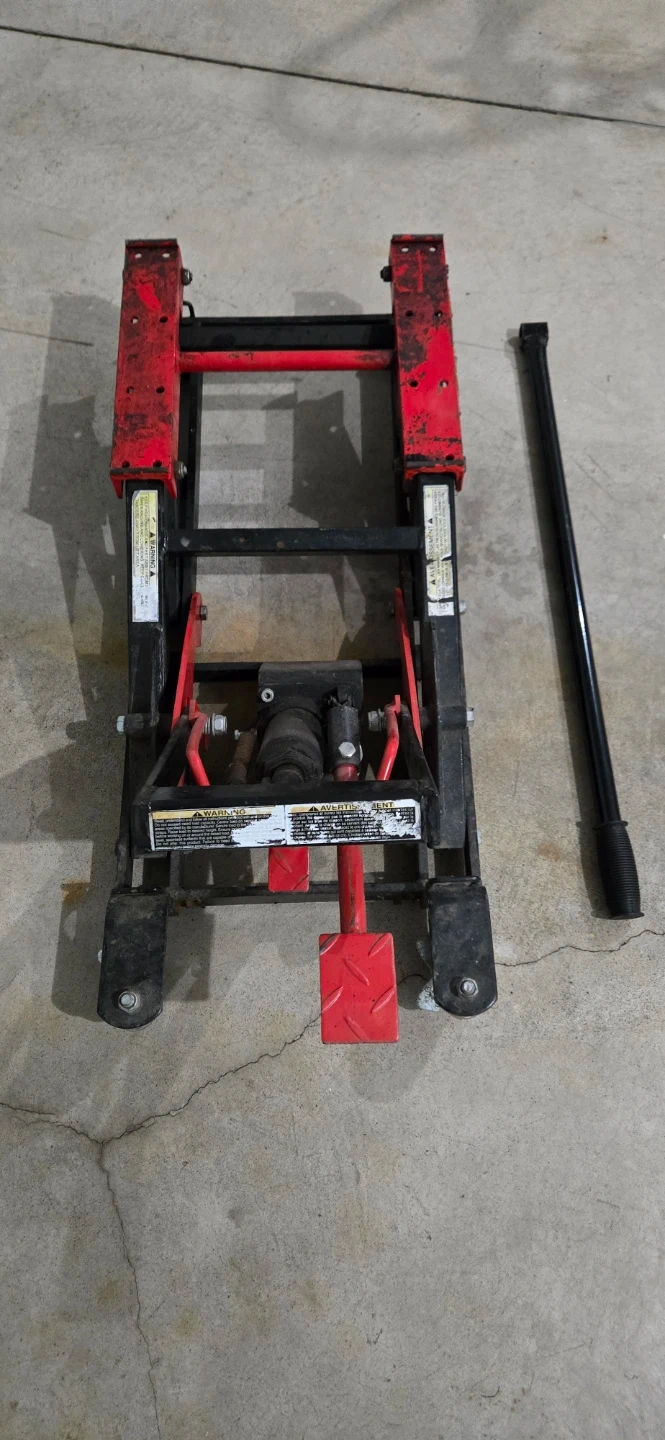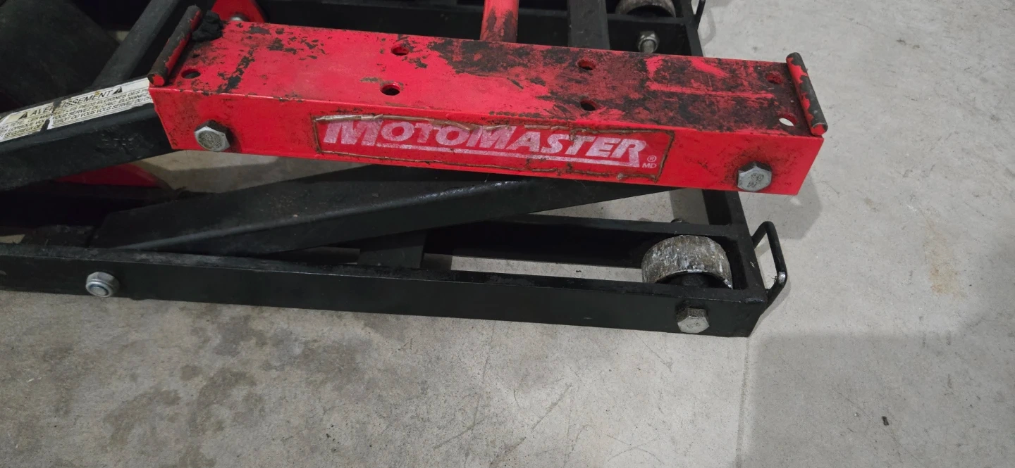 Motomaster motorcycle lift jack with handle. This lift is ideal for servicing your motorcycle. It has a foot pedal for easy lifting.
