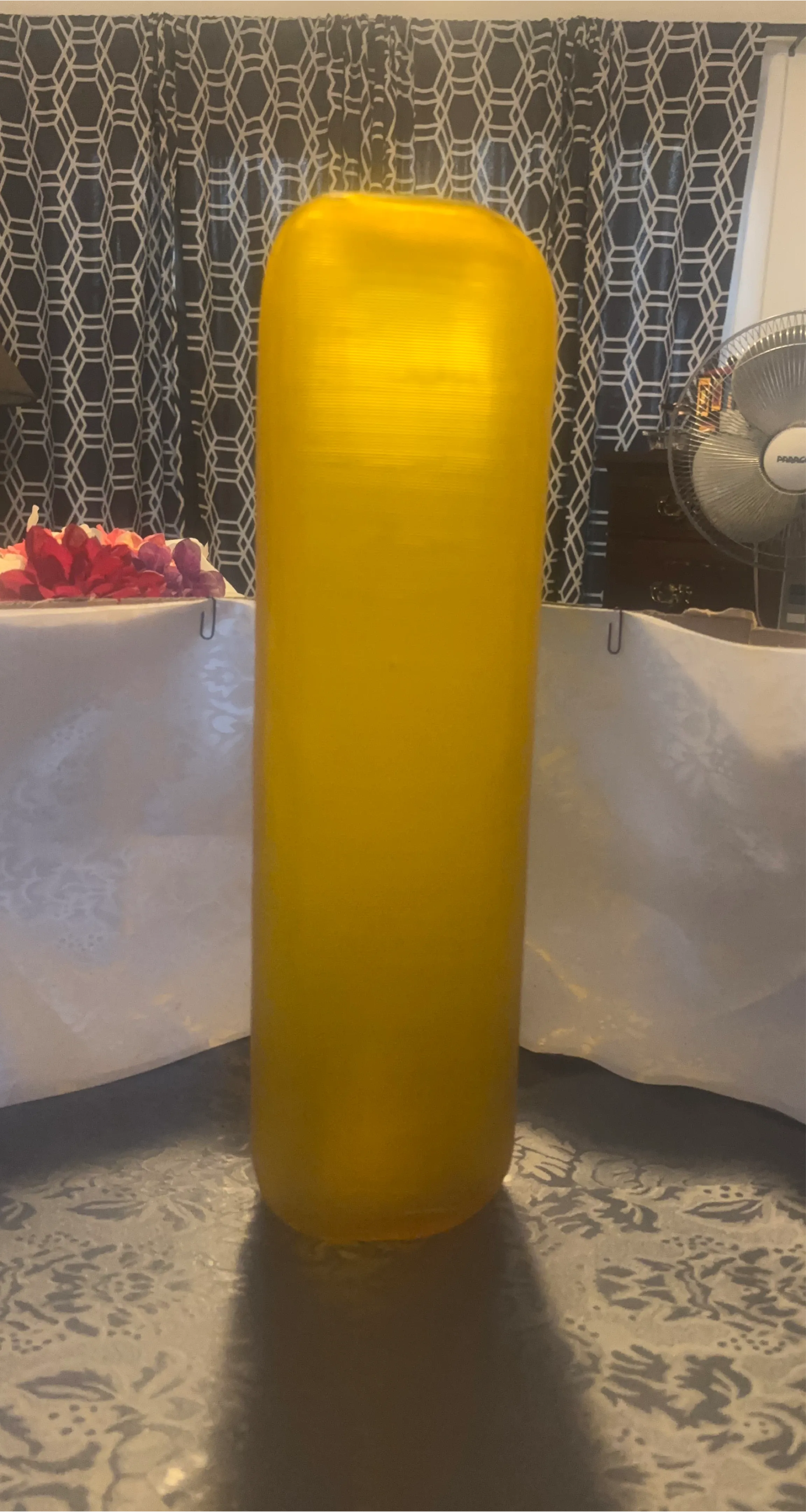 This is a tall, cylindrical vase in a bright yellow color. It's made of a solid material, likely ceramic or thick glass, and has a smooth finish. The interior is hollow to hold flowers.