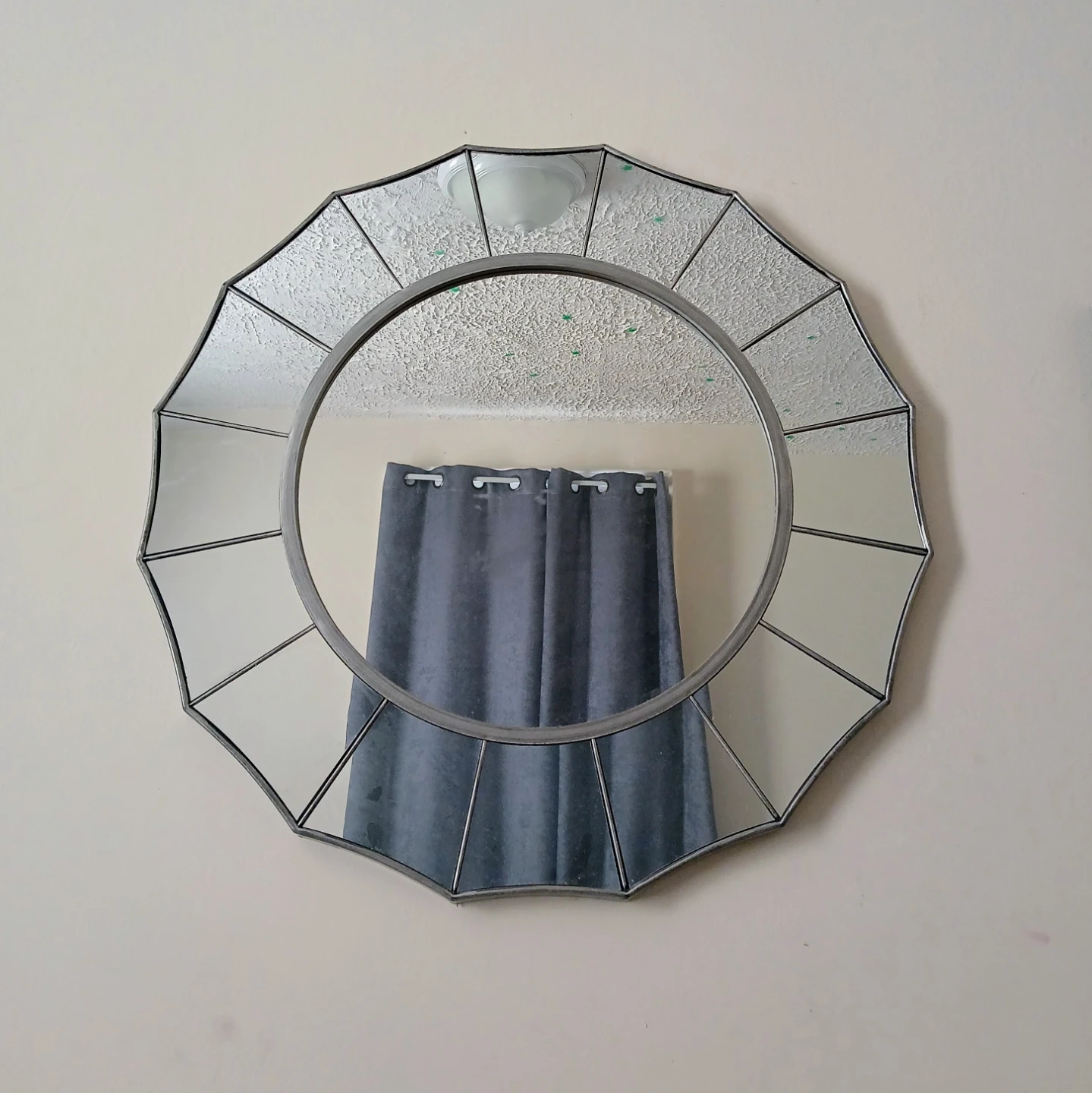 This decorative wall mirror features a sunburst design with a brushed metal frame. It's ideal for adding a touch of style to any room. The mirror has a diameter of approximately 24 inches.