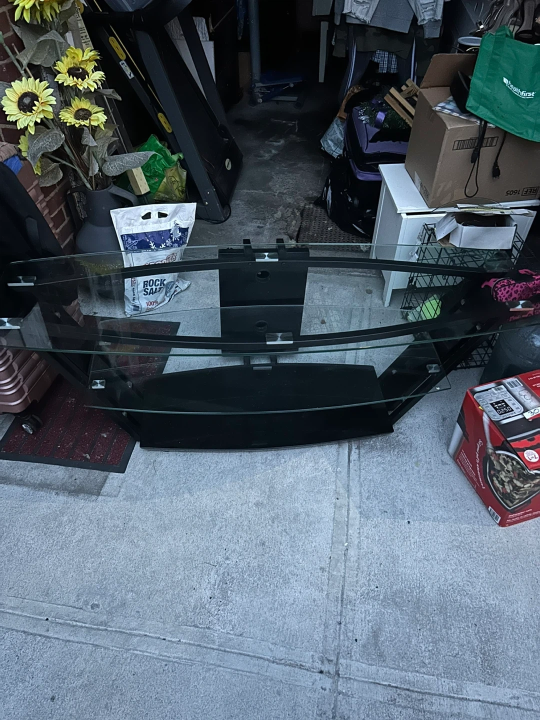 This is a three-tier glass TV stand with a sleek black metal frame. It offers ample space for media consoles and accessories. The curved glass shelves add a modern touch to any living area.