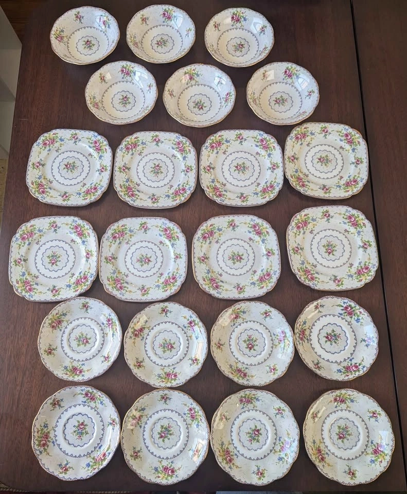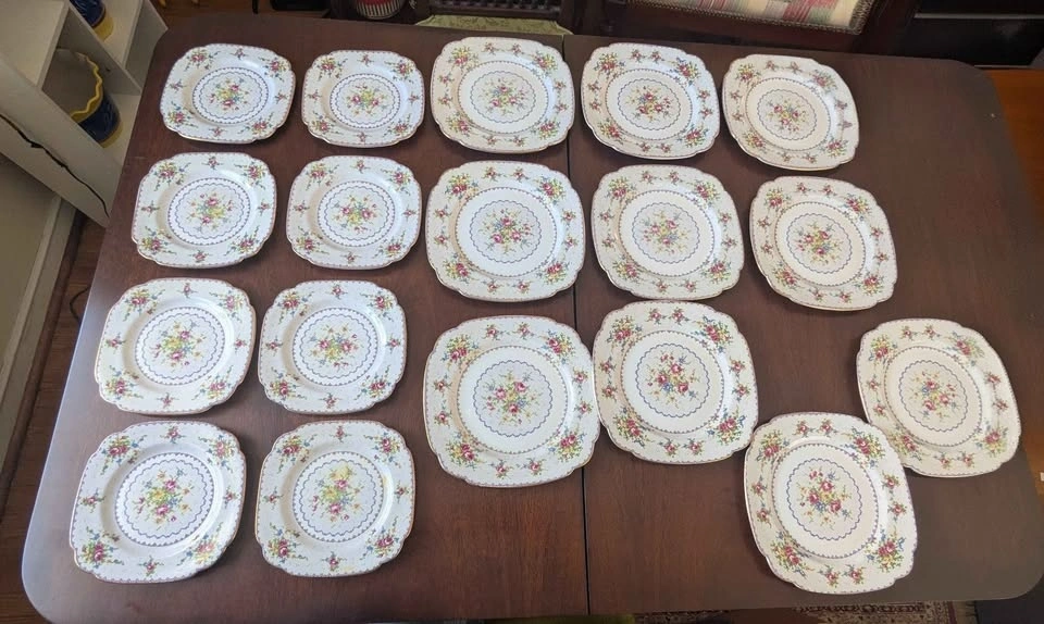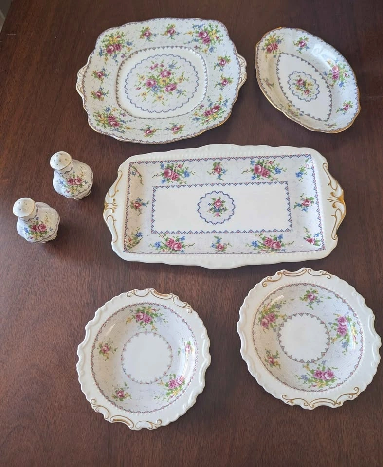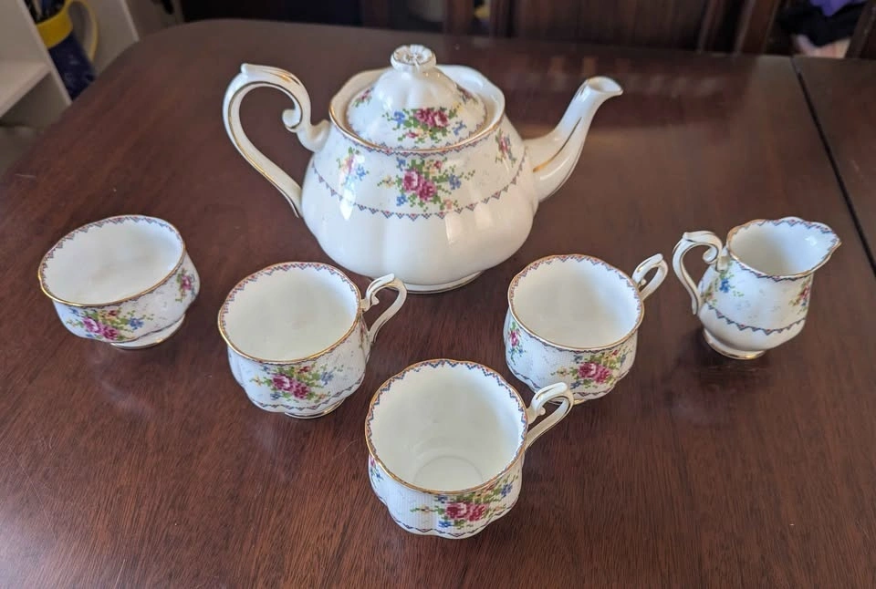 The "Petit Point" pattern features a pixelated floral motif resembling needlework, in shades of pink, blue, and yellow. The collection includes a teapot, teacups, saucers, dinner plates, square plates, serving dishes, a creamer, and a sugar bowl. One cup is not shown in pictures.
