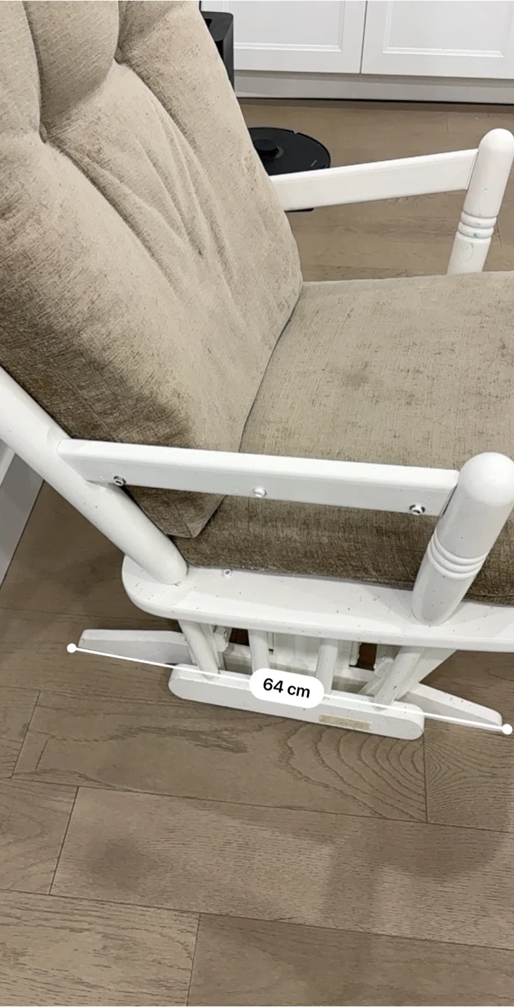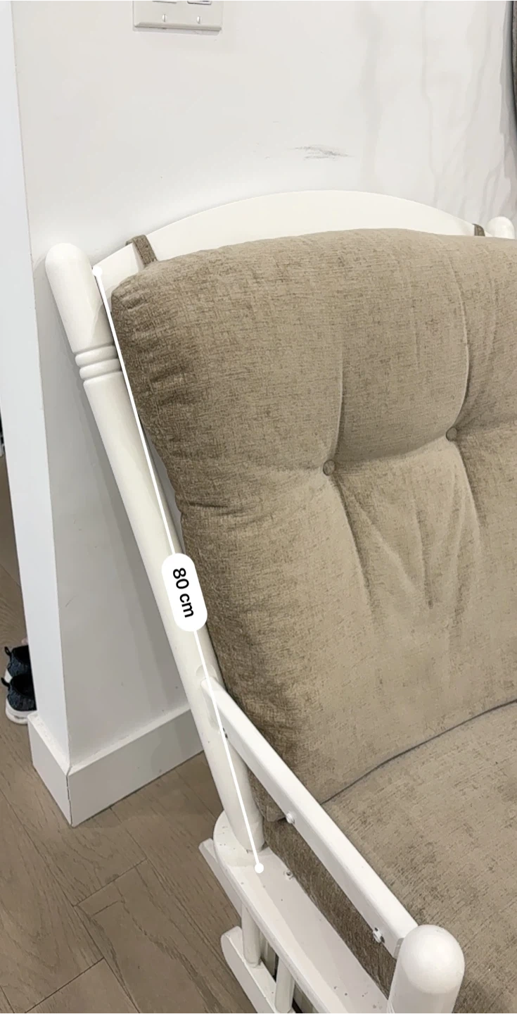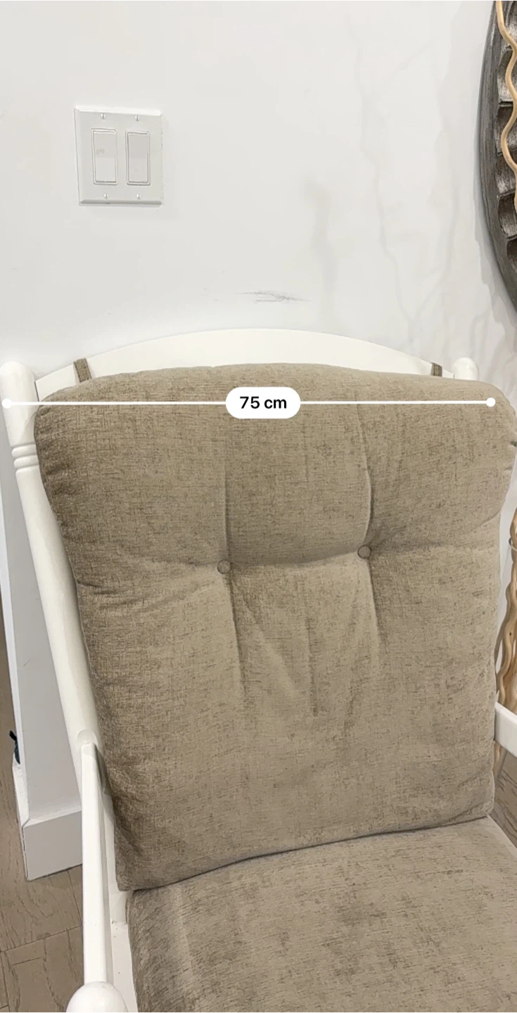 White glider rocking chair with comfy, tufted beige cushions. It's 108 cm tall and 75 cm wide. The base is 64 cm wide.