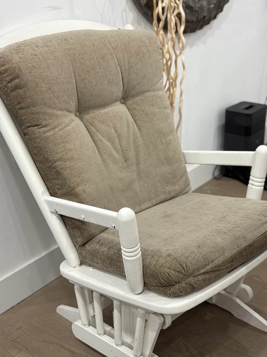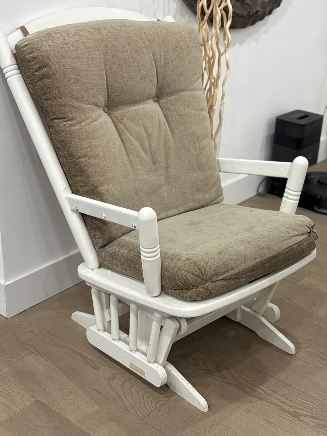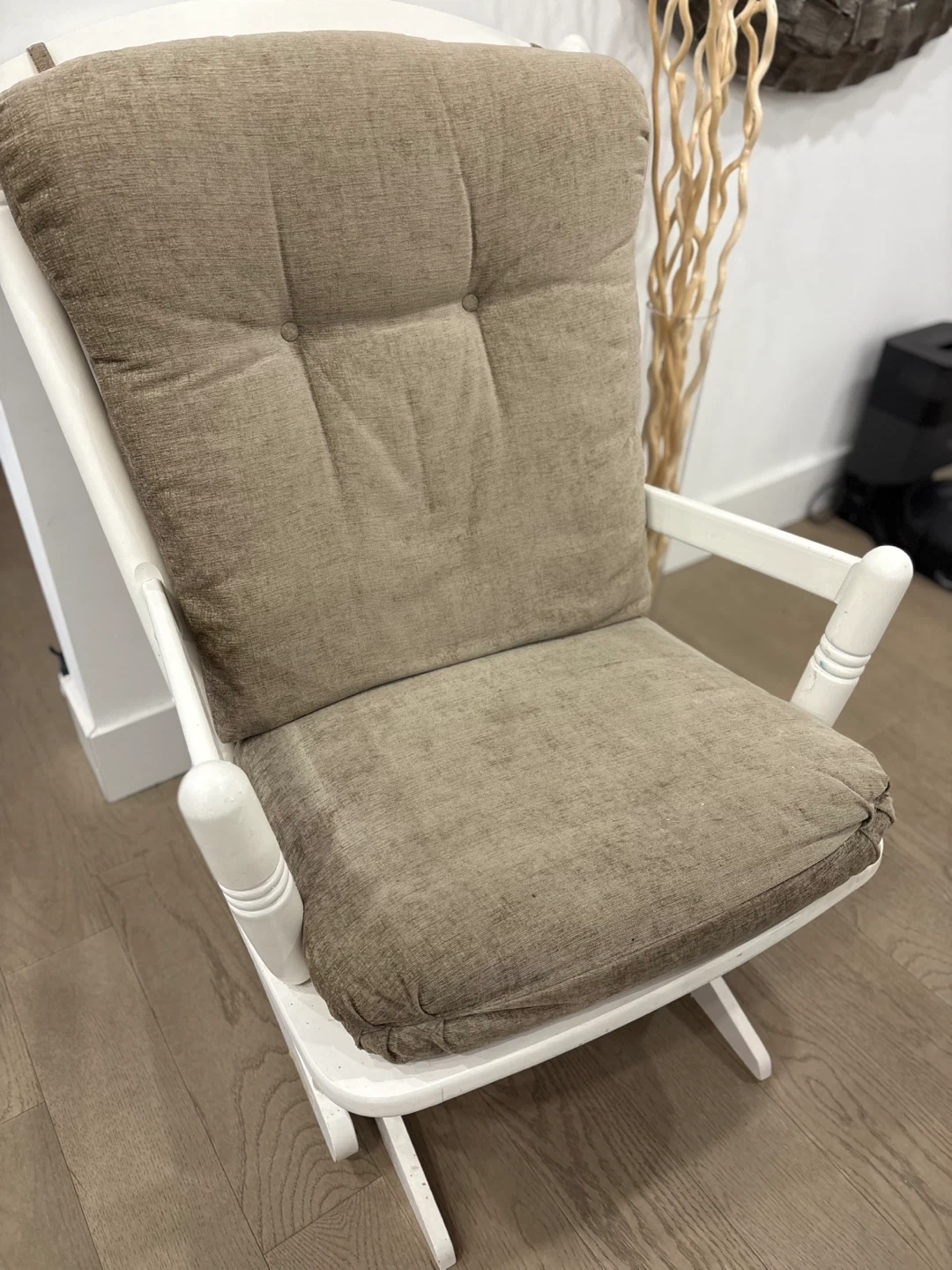 White Glider Rocking Chair with Tufted Beige Cushions