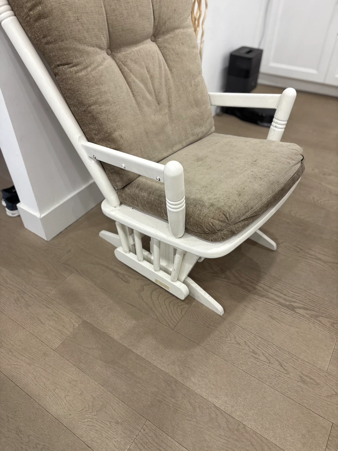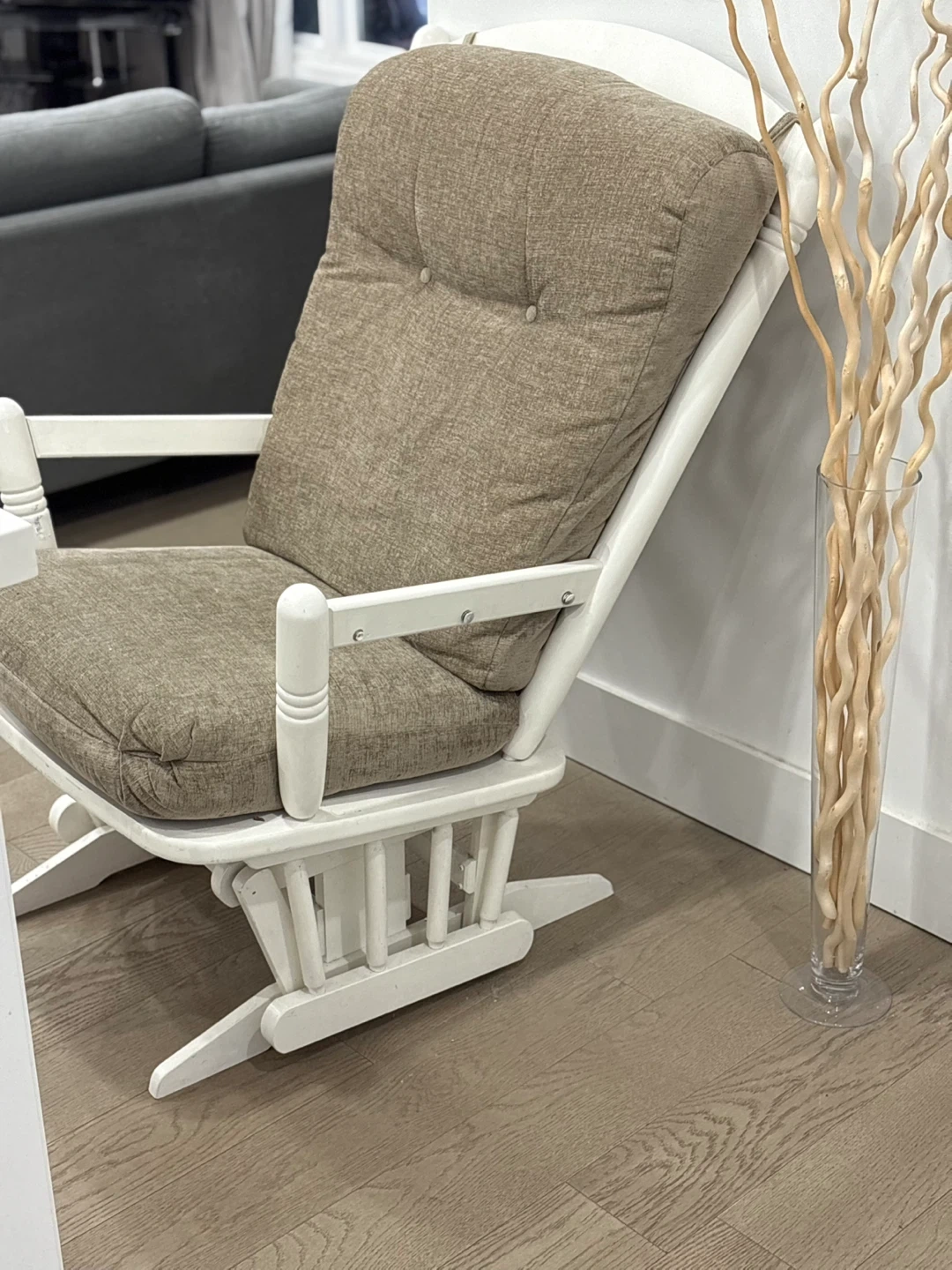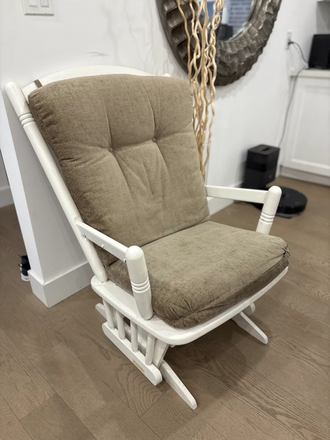 White Glider Rocking Chair with Tufted Beige Cushions