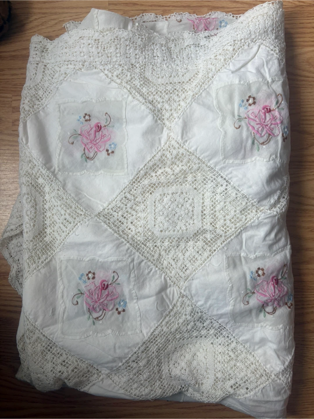 White Quilt with Pink Floral Embroidery and Lace Trim
