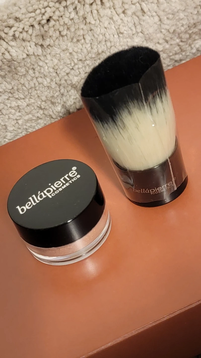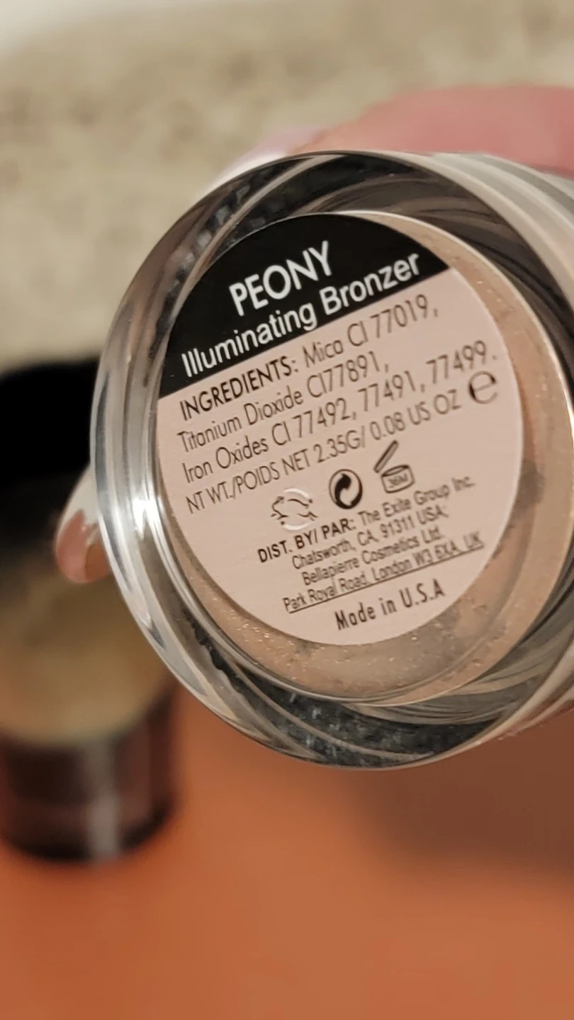 This is a Bellapierre Cosmetics Peony Illuminating Bronzer. It's a mineral makeup product. Net weight is 2.35g / 0.08 US OZ. Made in the U.S.A. A kabuki brush is also included.