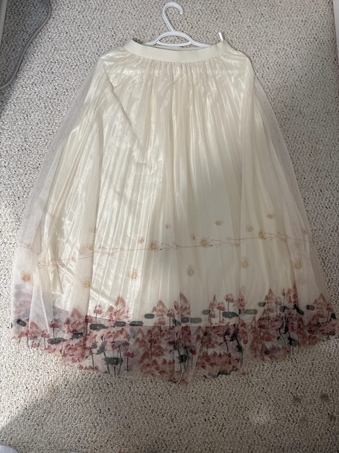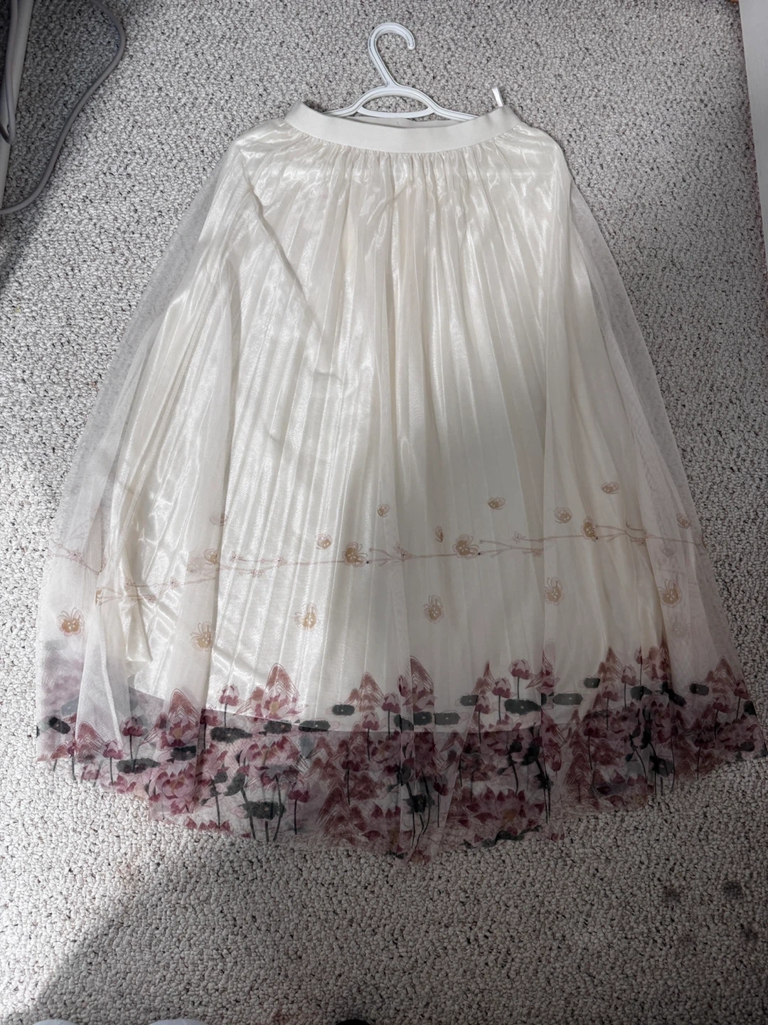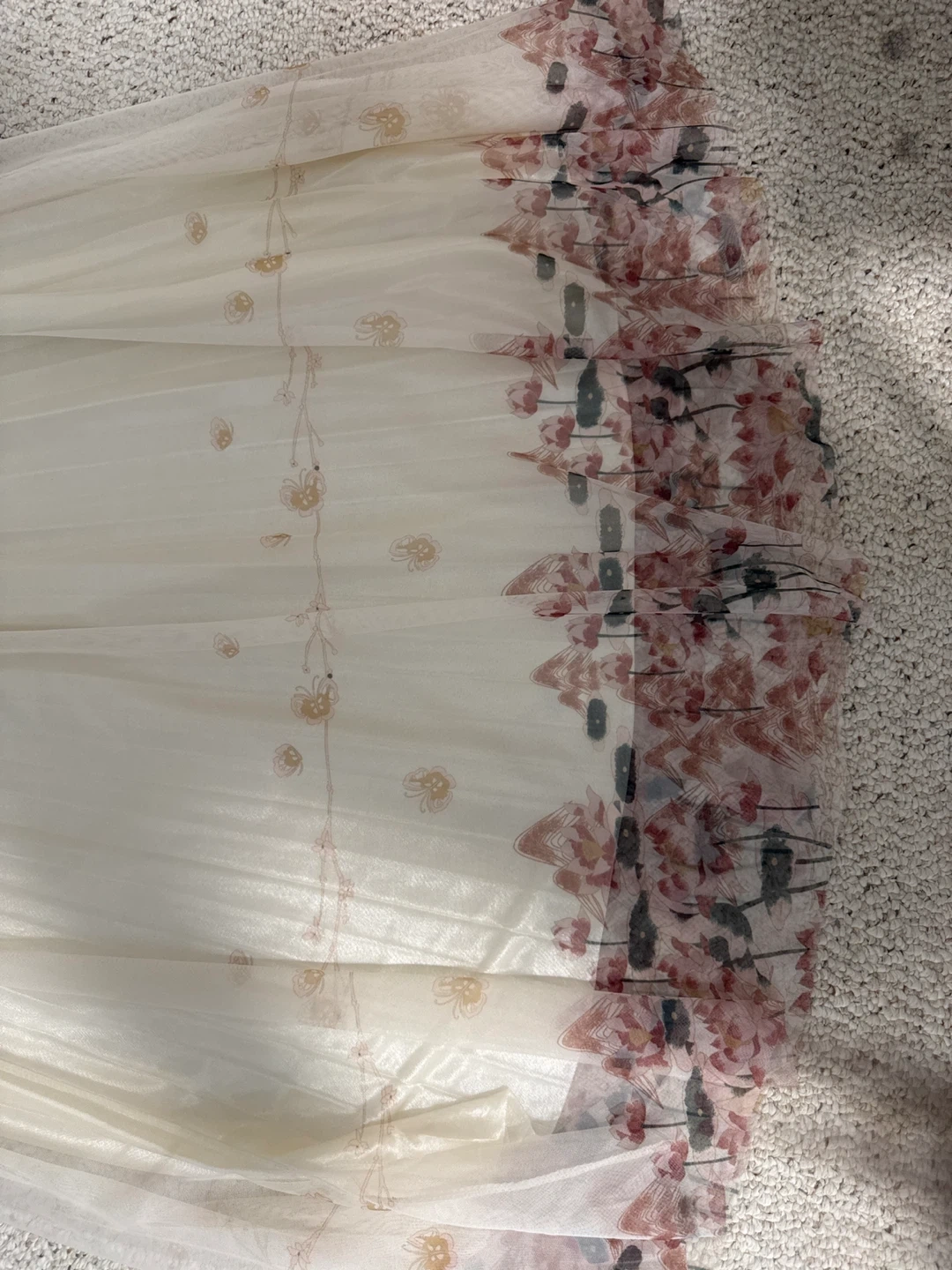 This is a white pleated tulle skirt. It has a beautiful floral print along the hem. The skirt features a sheer overlay and delicate embellishments.