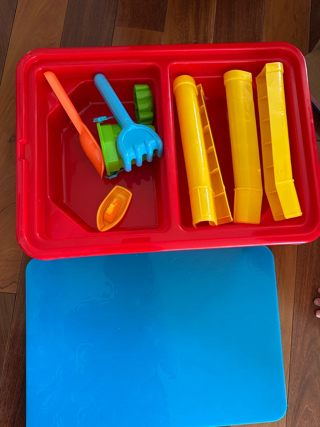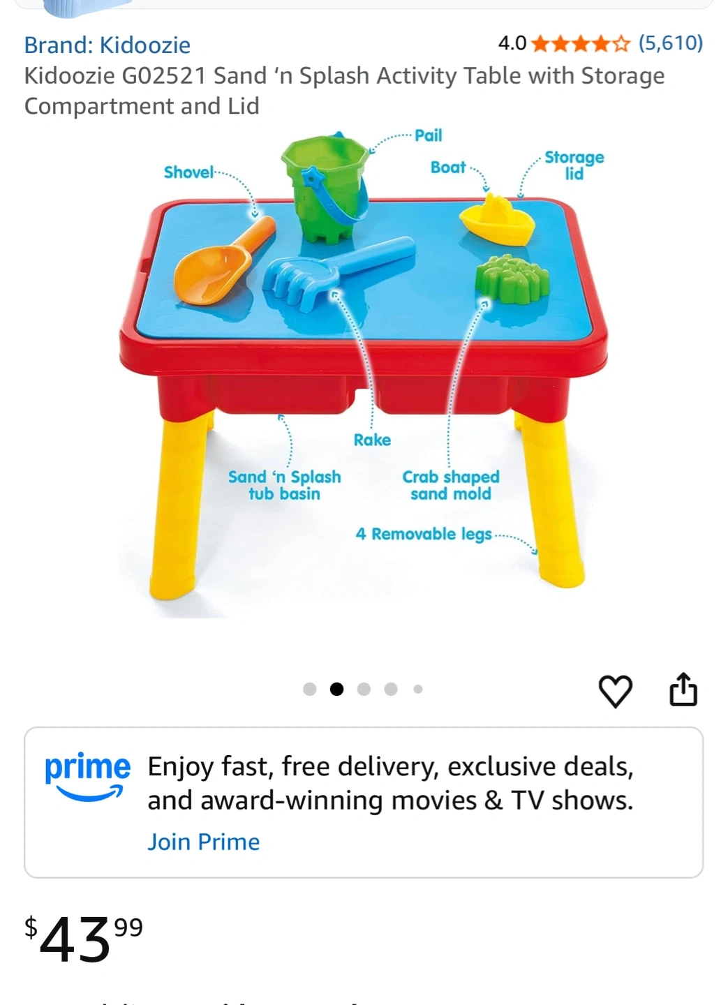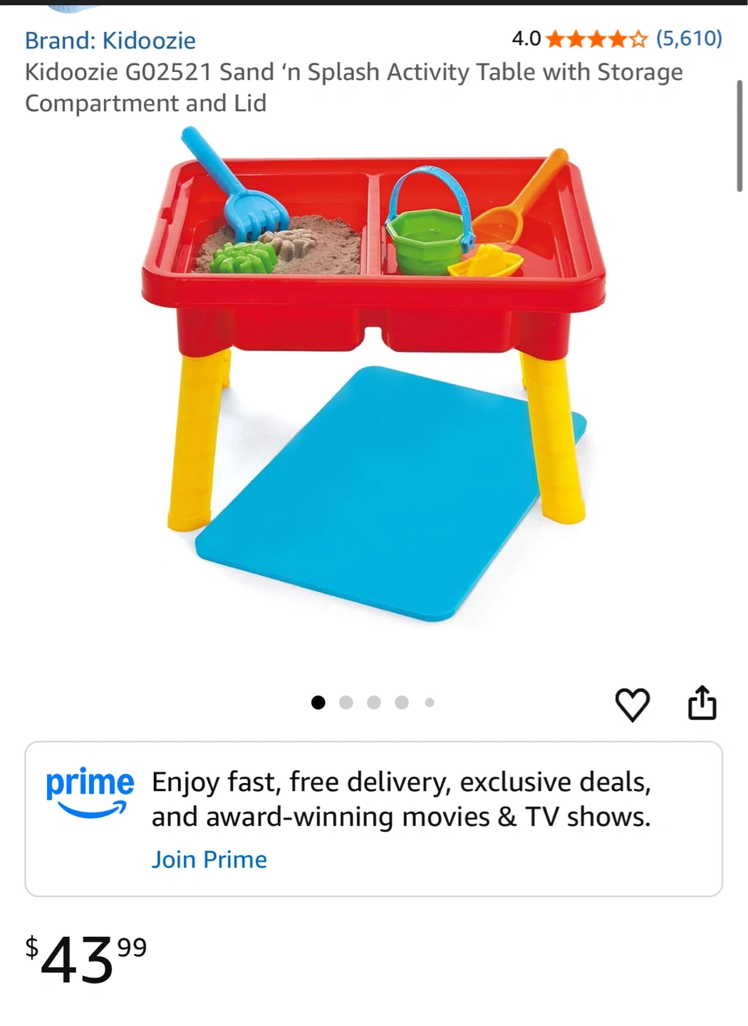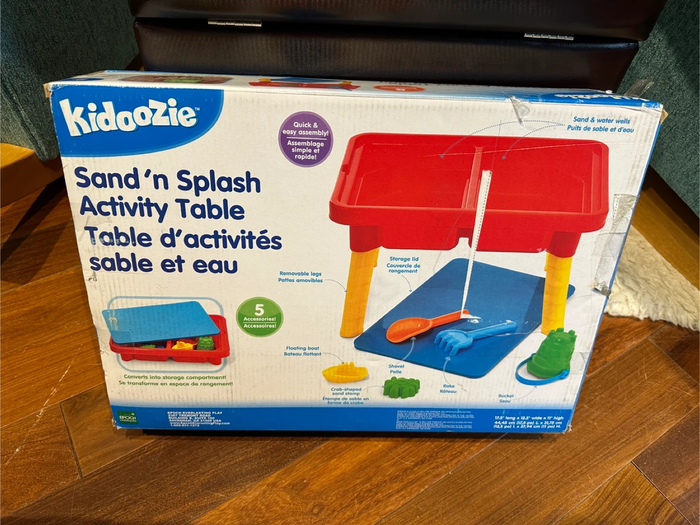 This Kidoozie Sand 'n Splash Activity Table is great for sand and water play! It comes with 5 accessories including a shovel, rake, pail, boat, and crab-shaped mold. The table also converts into a convenient storage container with a lid. It's perfect for outdoor fun and creative play!