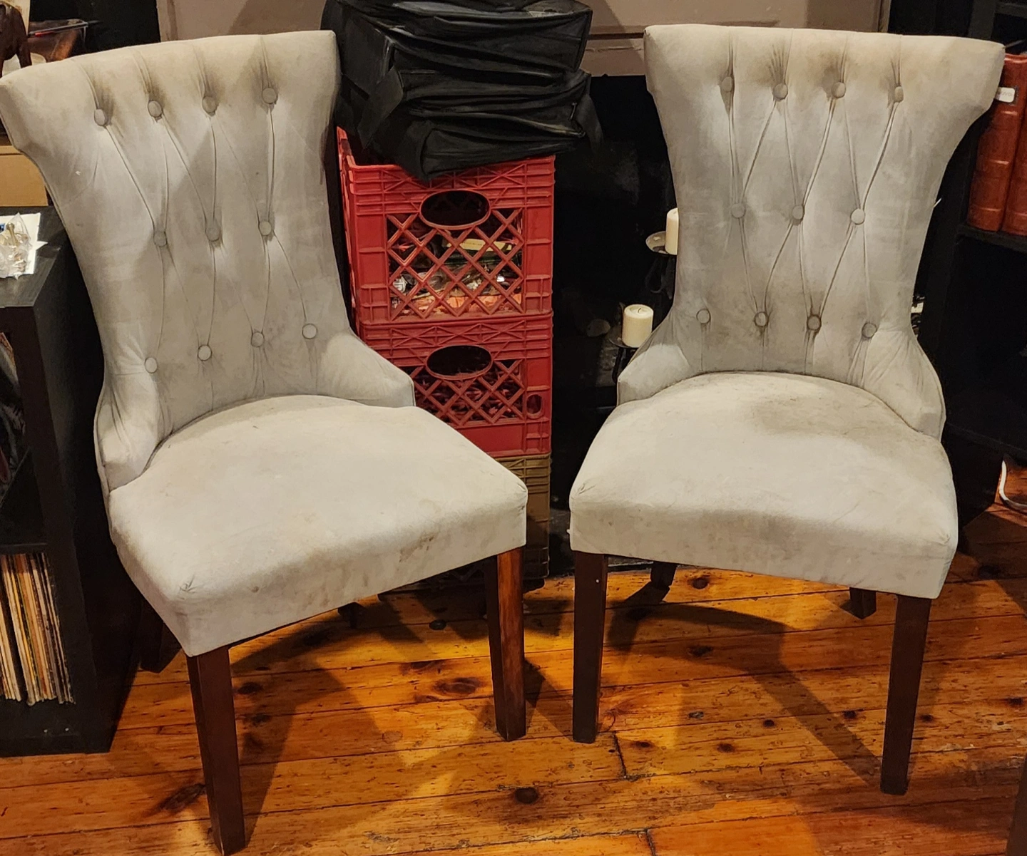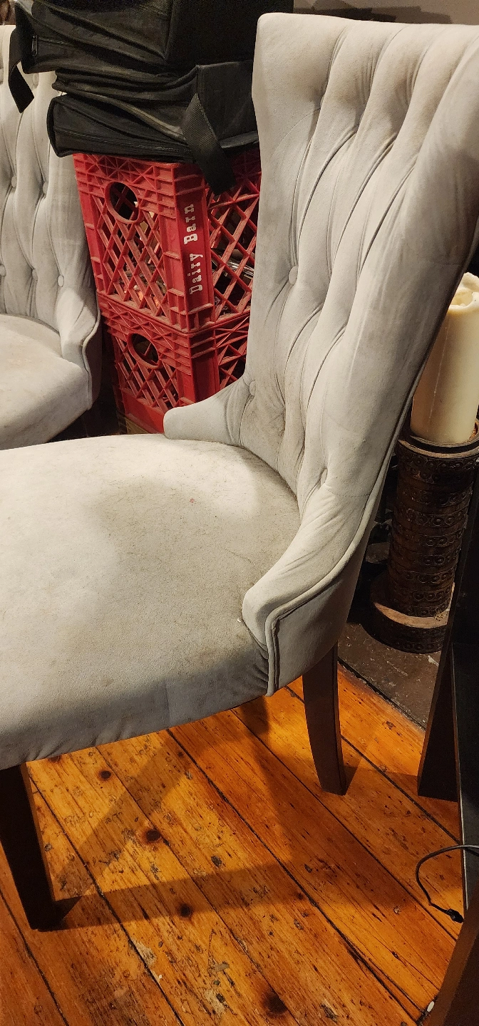 Two (2) gray upholstered dining chairs for elegant intimate meals. Button tufted backs. Dark brown wooden legs. Minor wear.