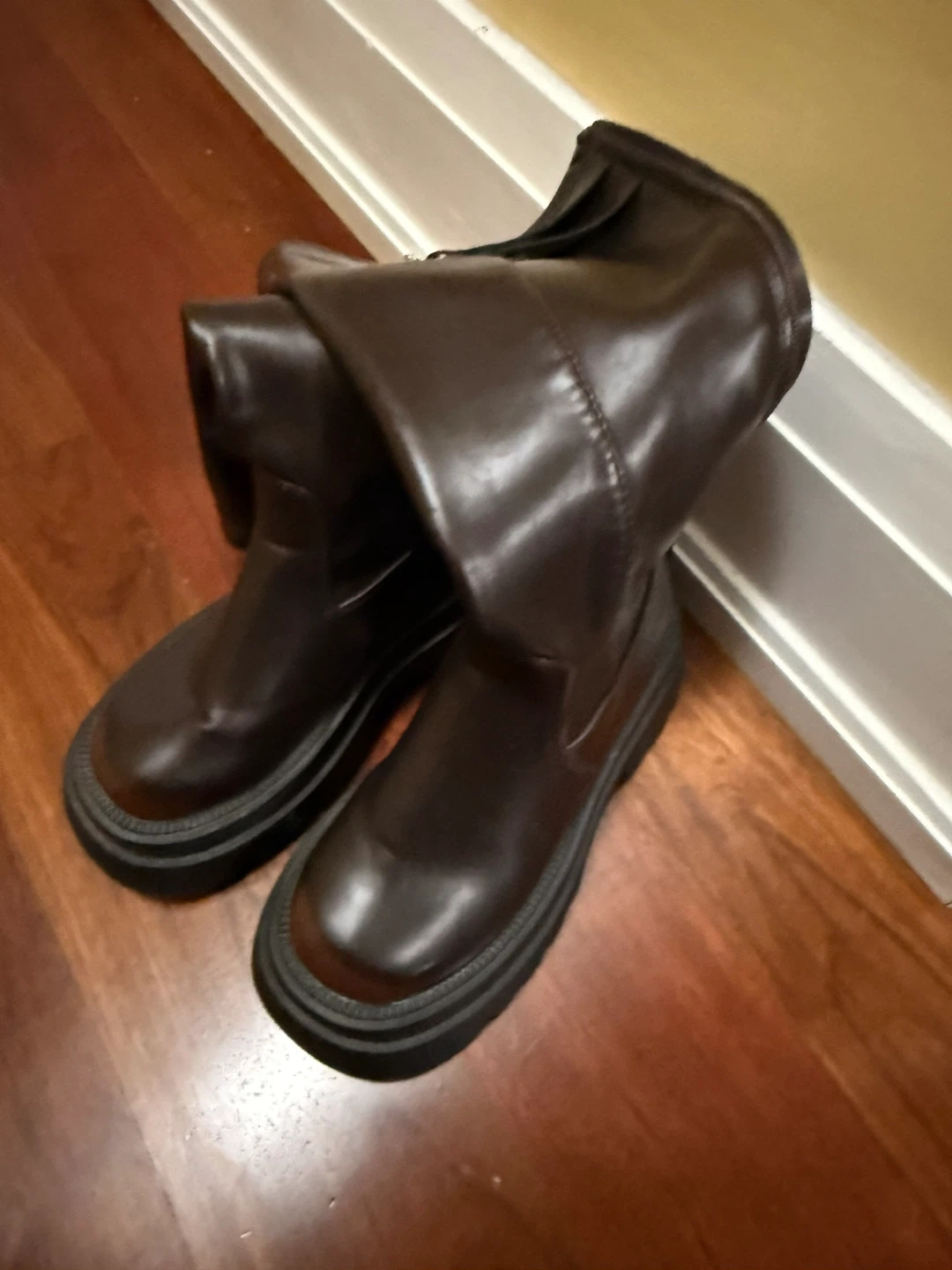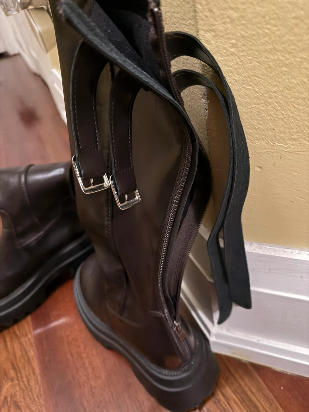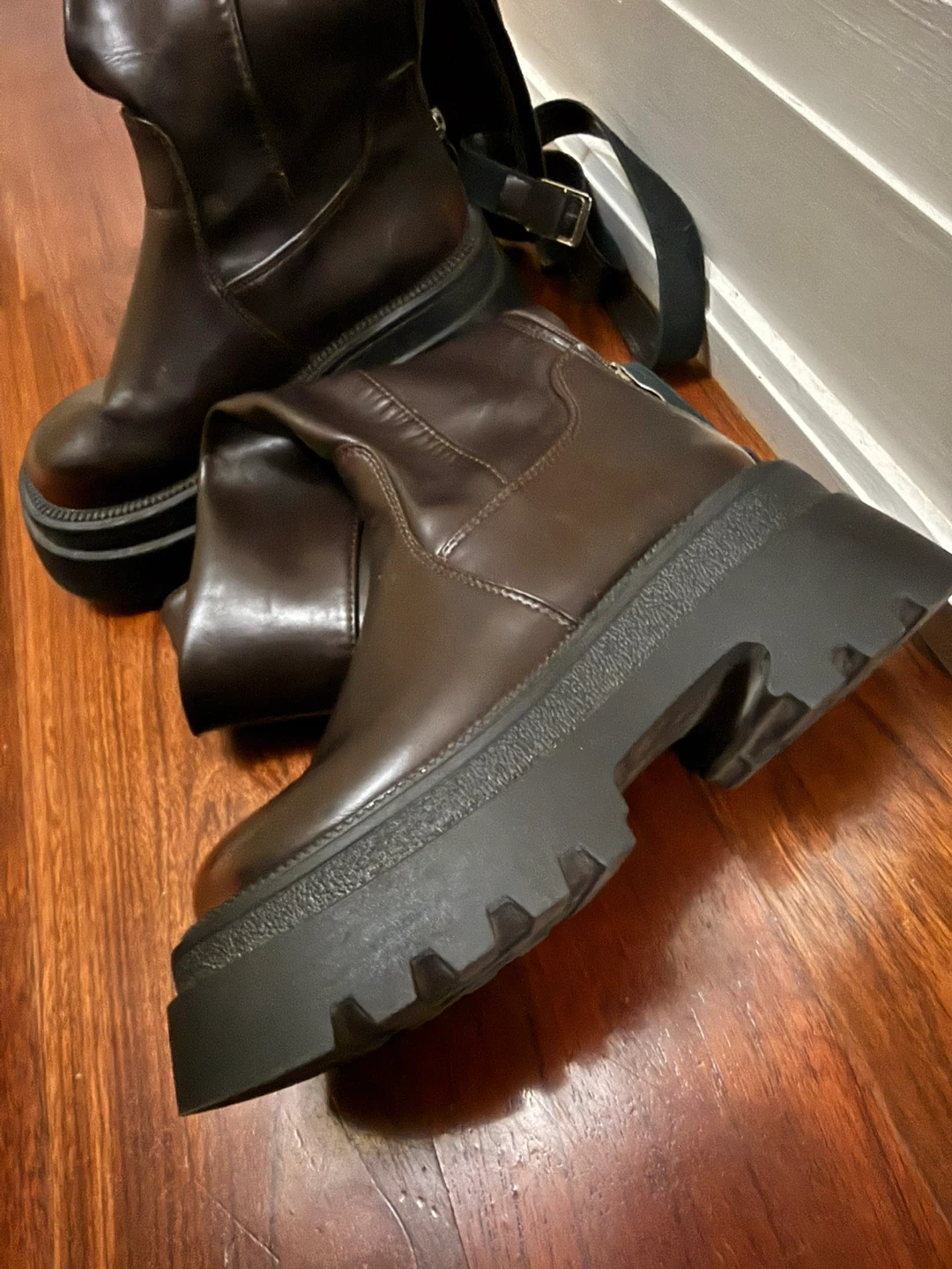 These stylish brown boots feature a chunky platform sole and adjustable buckle straps for a secure fit. They're made from a glossy faux leather material. The side zipper makes them easy to slip on and off. These boots are perfect for adding a bold edge to any outfit!