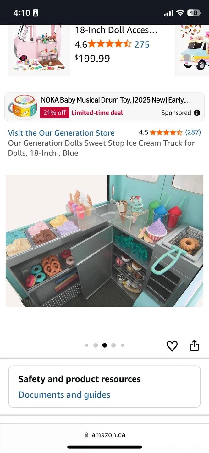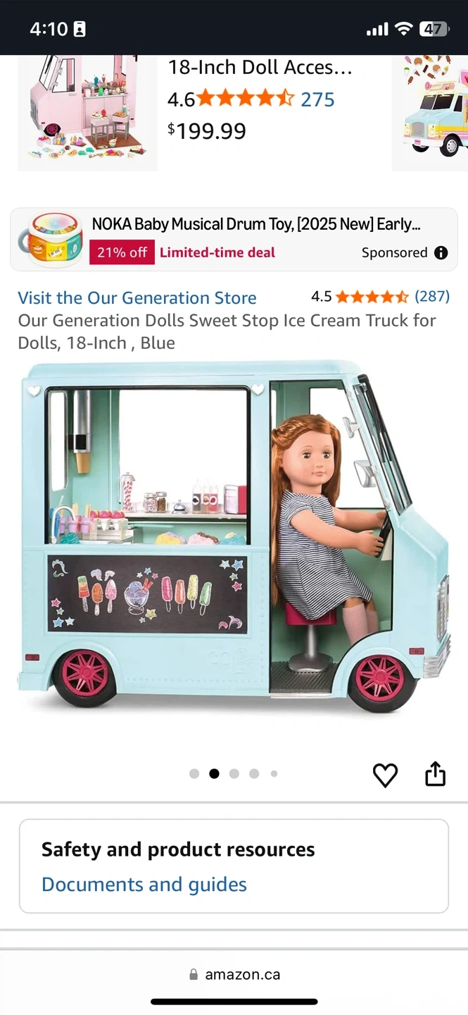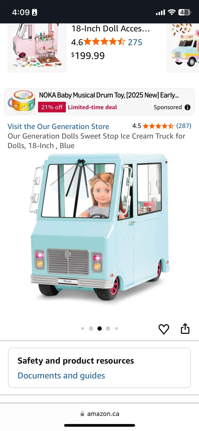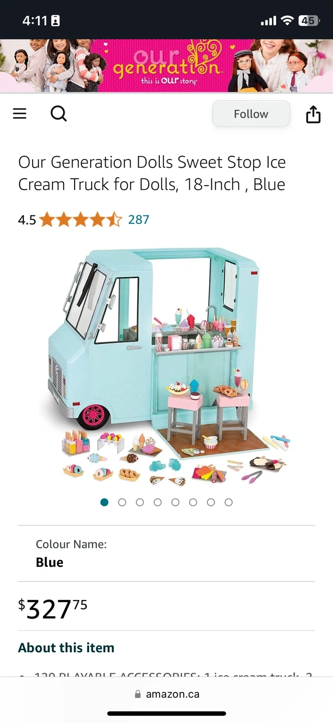 This Our Generation Sweet Stop Ice Cream Truck is perfect for 18-inch dolls. It's a fun blue colour and comes with lots of accessories for endless play. Kids can serve up pretend treats with this detailed playset! Doll not included. Selling on Amazon for $325+ Tax. Offered for $100. Plush toy FREE ($40 value).
