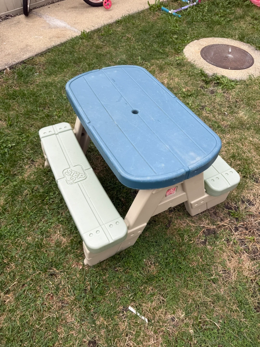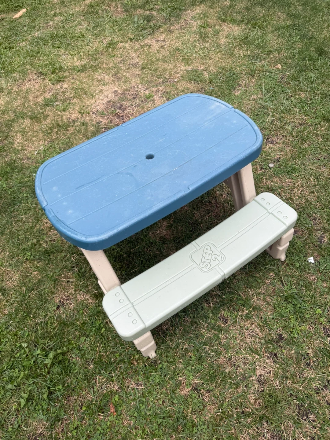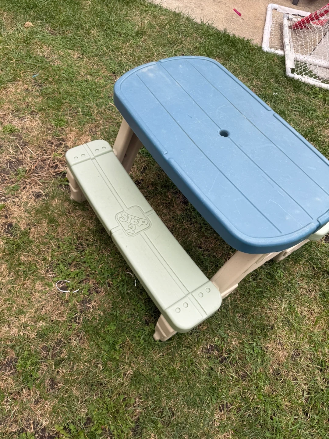 Selling a Step2 kids picnic table. It's in good condition and perfect for outdoor fun! The table features a blue tabletop and light green benches.