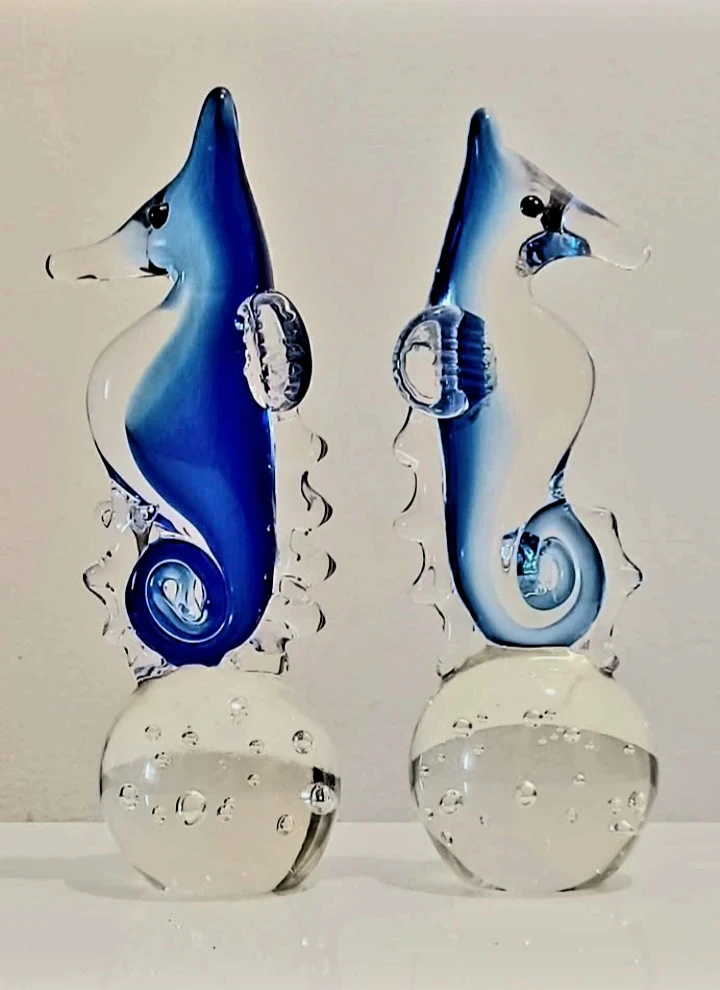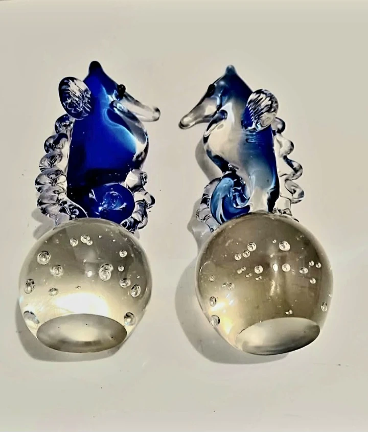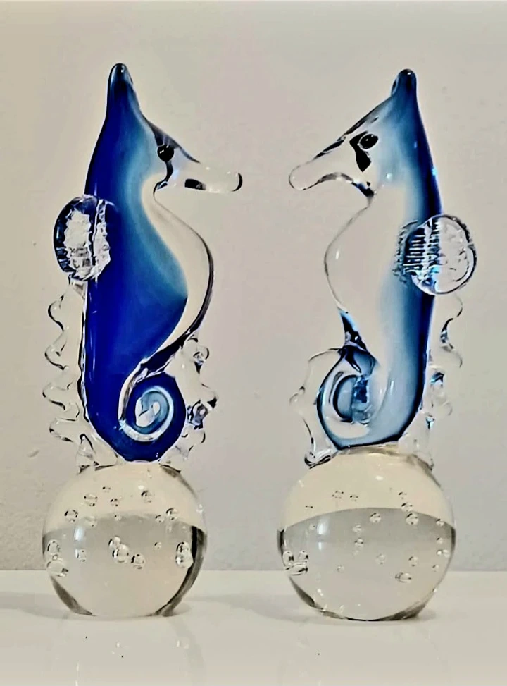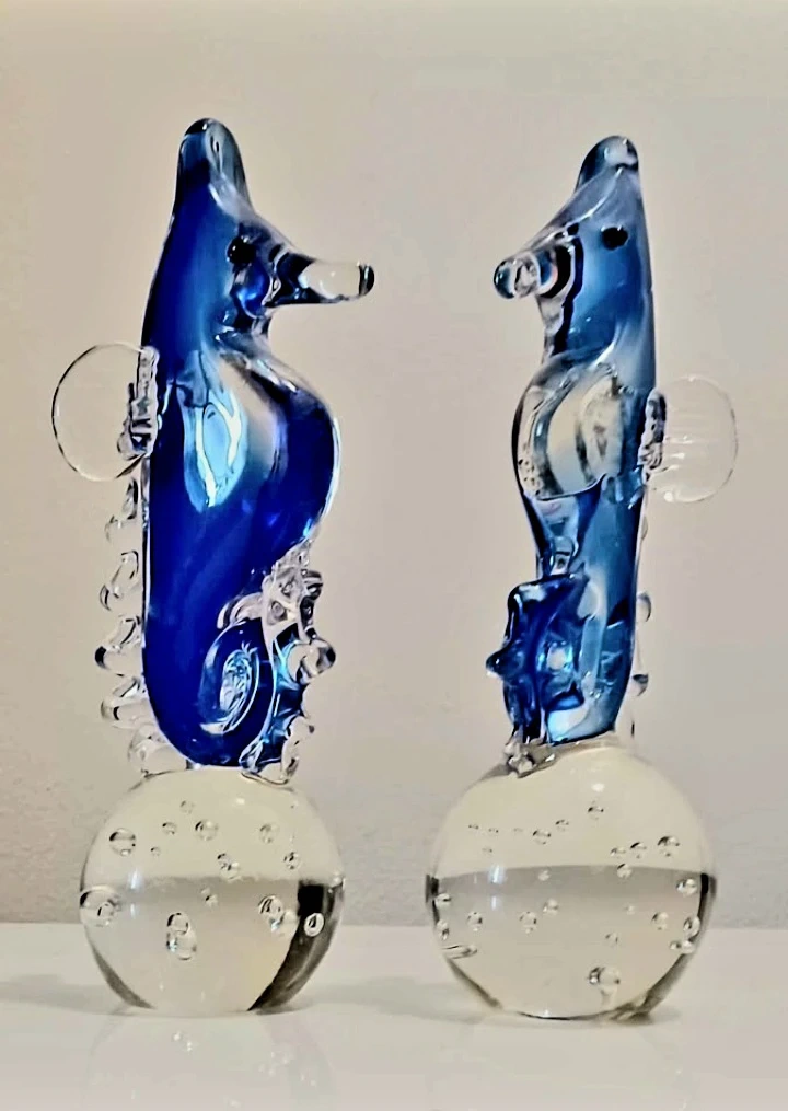 These are a vintage pair of Controlled Bubbles, Hand-blown Crystal Seahorses. Each seahorse features a unique controlled bubble design, adding a touch of elegance to any collection or display.