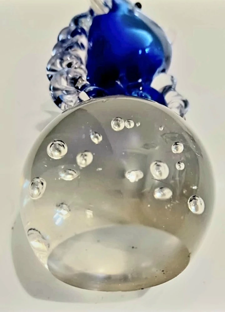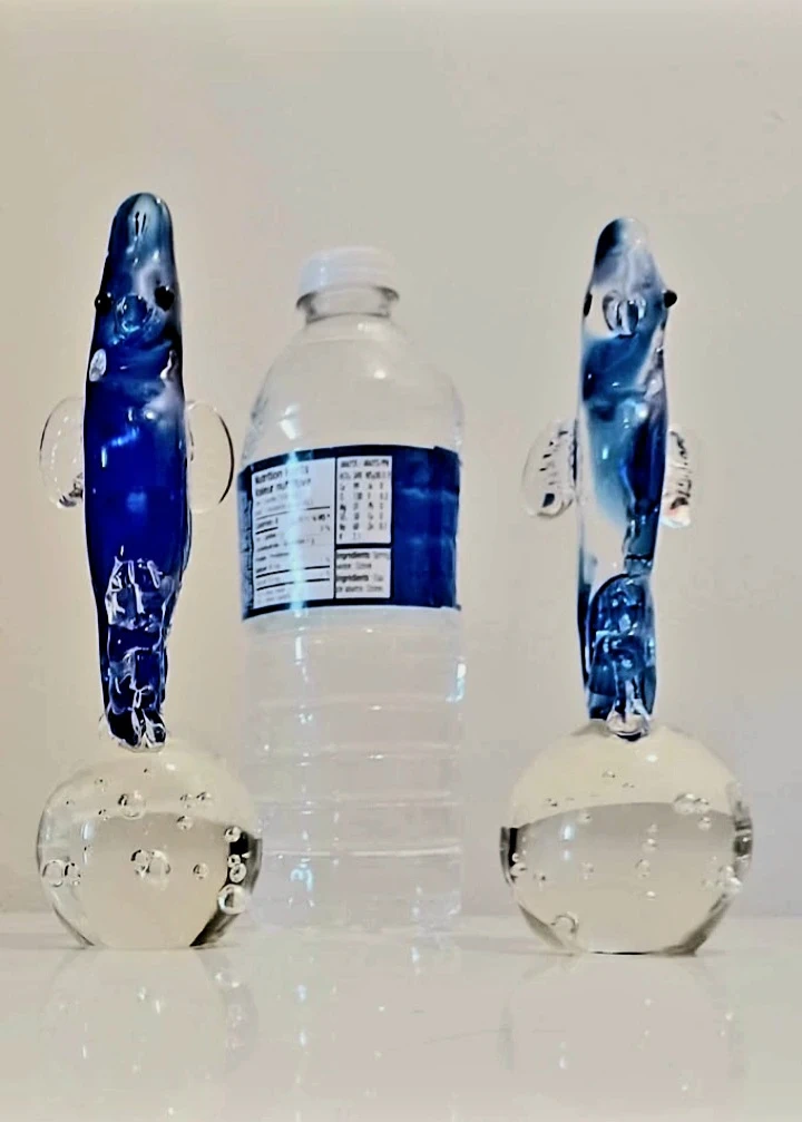These eye-catching glass sculptures feature a blend of clear and cobalt blue hues, with intricate detailing and controlled bubble accents that enhance their visual appeal.