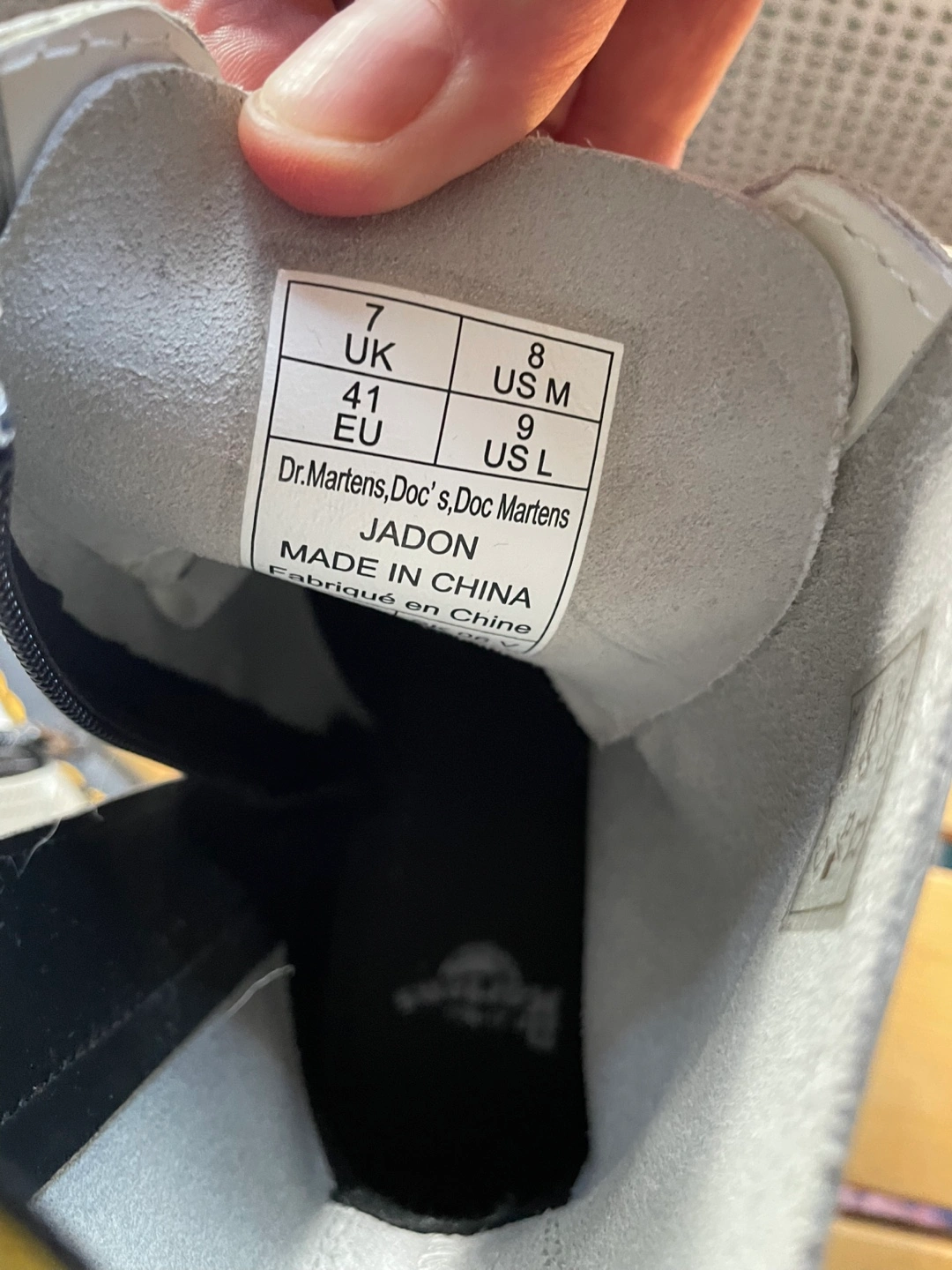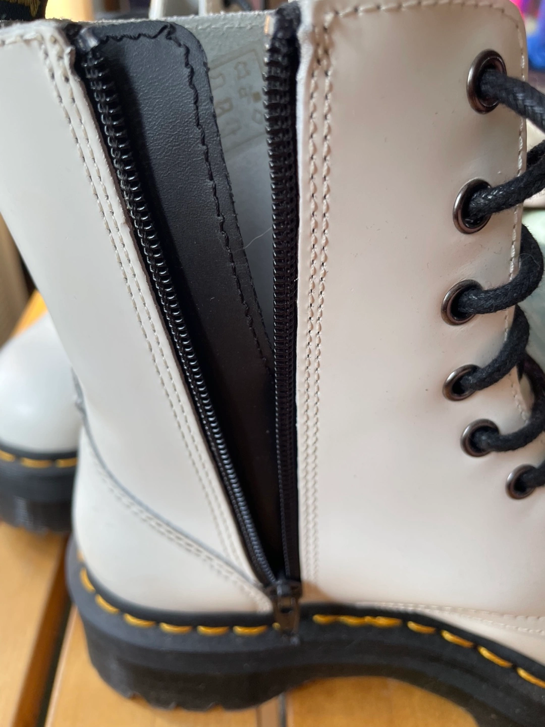 Selling a pair of Dr. Martens Jadon boots in white. These are a women's US size 9 / UK size 7. They have a platform sole and the classic Dr. Martens look with black laces and a side zipper. Never worn, these are like new.