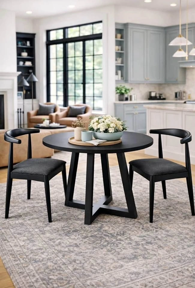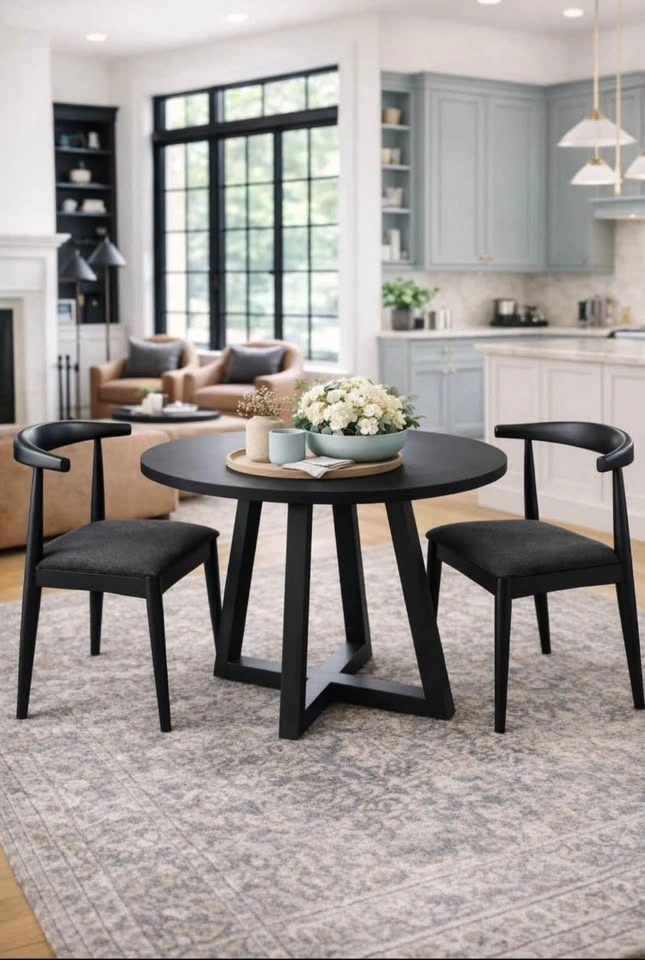 Modern black round dining table, perfect for condos or smaller spaces. Seats up to 4. Table dimensions: 36” round x 30”H. Made of manufactured wood. Brand new in box. Pickup in North York or Midtown Toronto. Please message with any questions. Chairs have been sold.