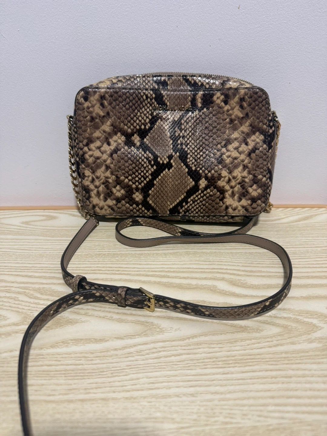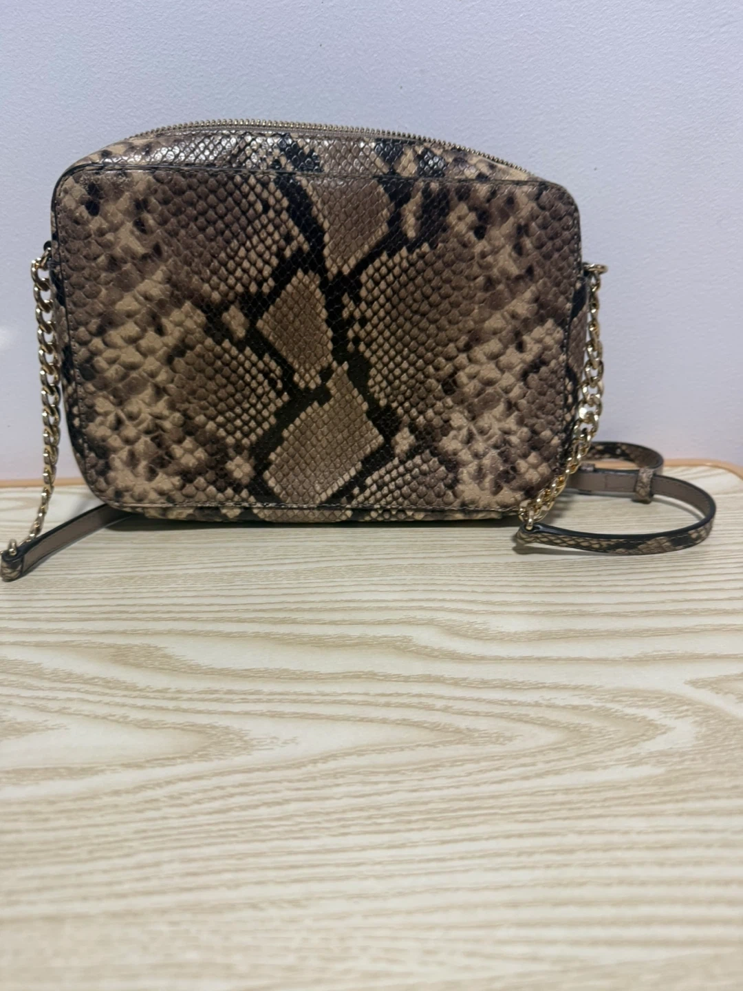 Michael Kors crossbody bag with a snake print exterior. It features a zip closure and a chain and leather strap. Interior is lined with branded fabric.