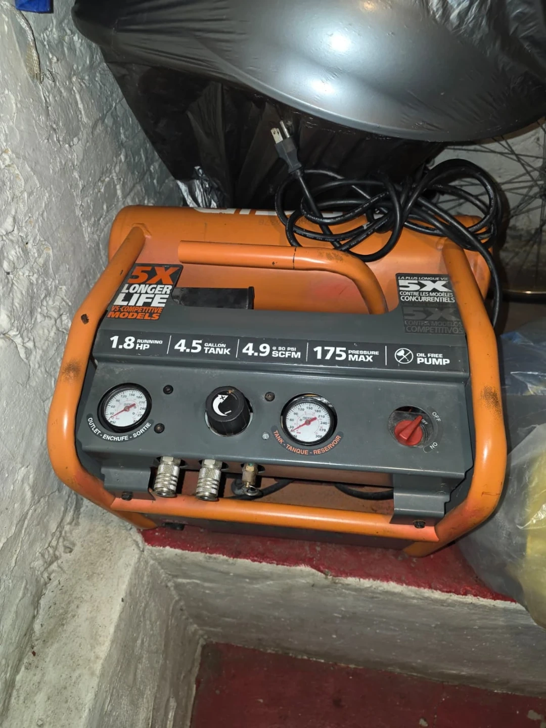 Ryobi 1.8 HP air compressor with a 4.5 gallon tank. It's oil-free and has a maximum pressure of 175 PSI. Features two outlets and gauges for tank and outlet pressure.