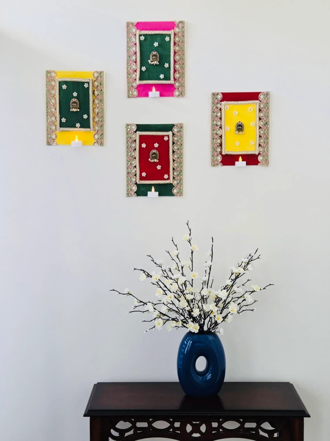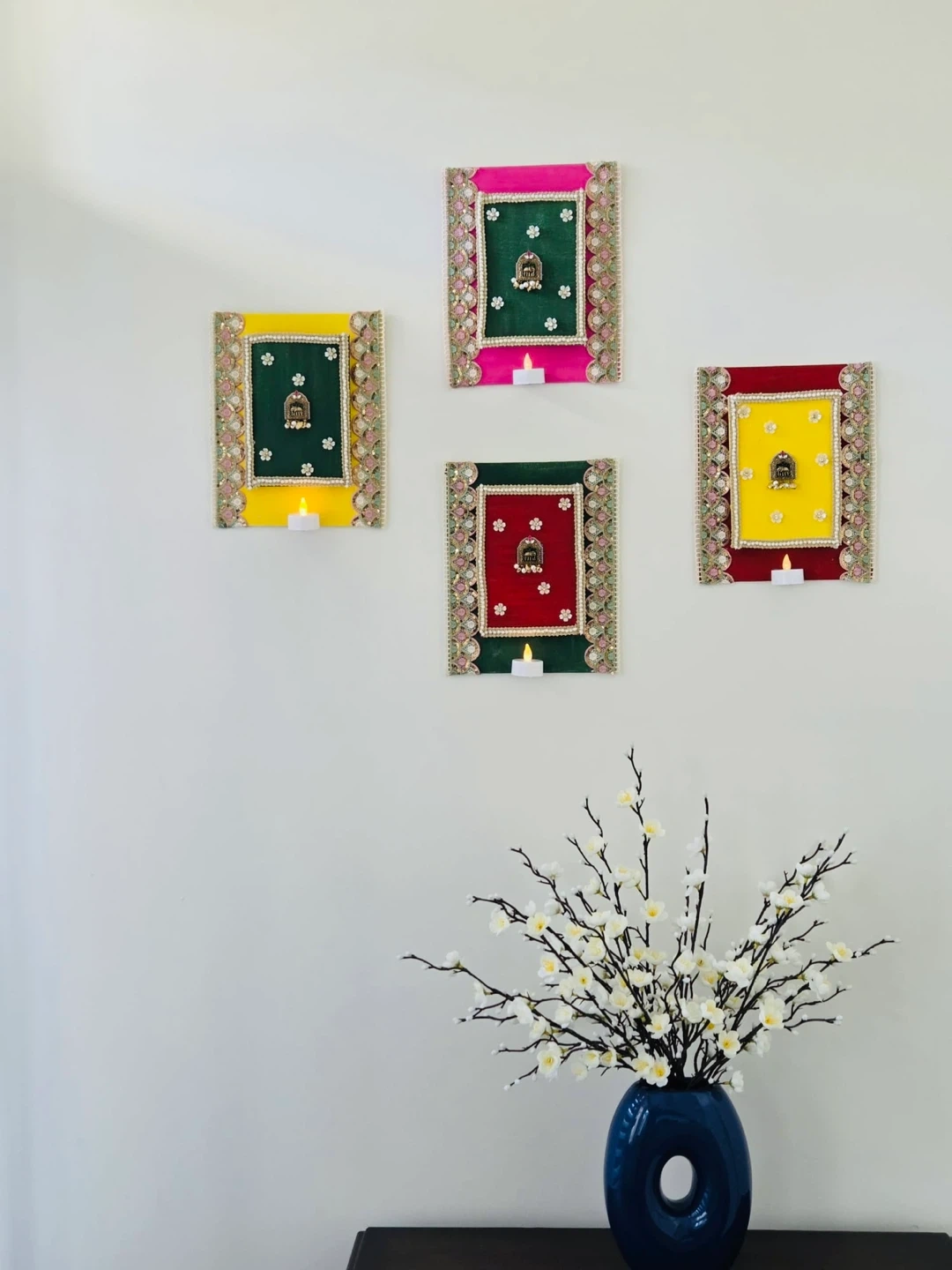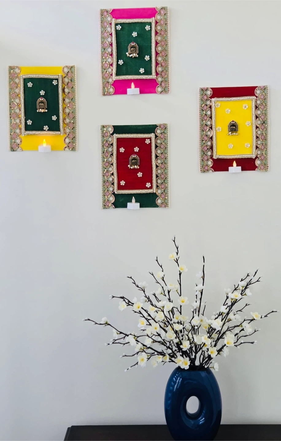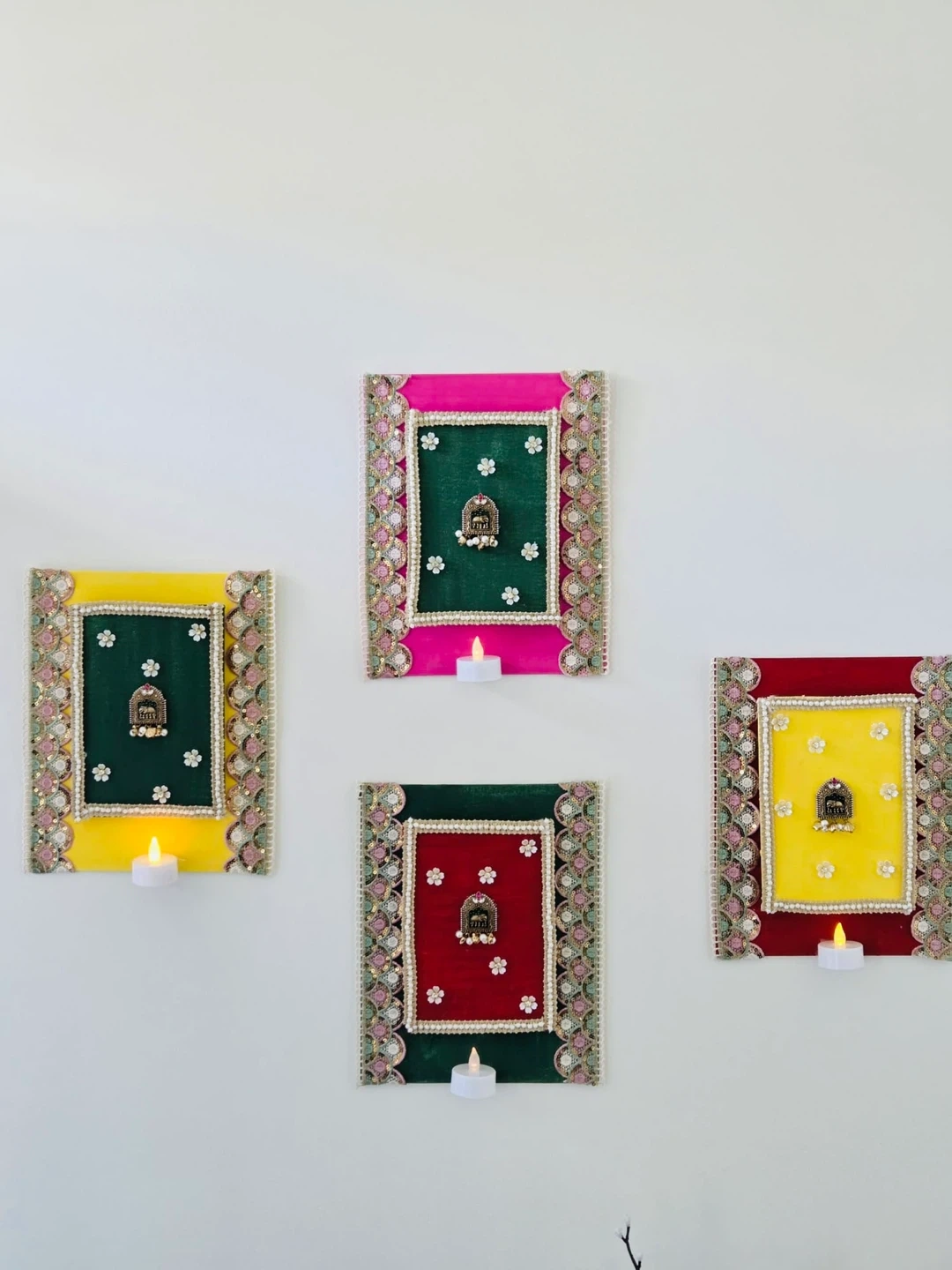 I'm selling a set of four decorative wall art frames. They feature colourful designs with intricate beadwork and small candle holders. The frames are in excellent condition and would add a unique touch to any room!