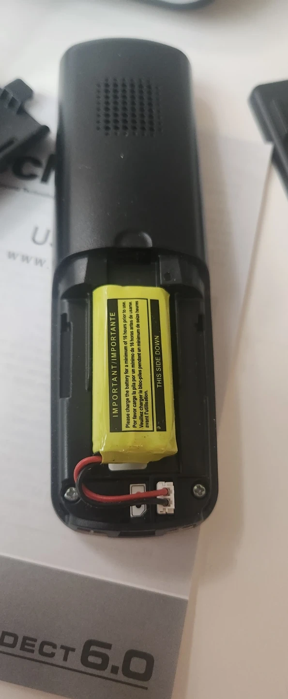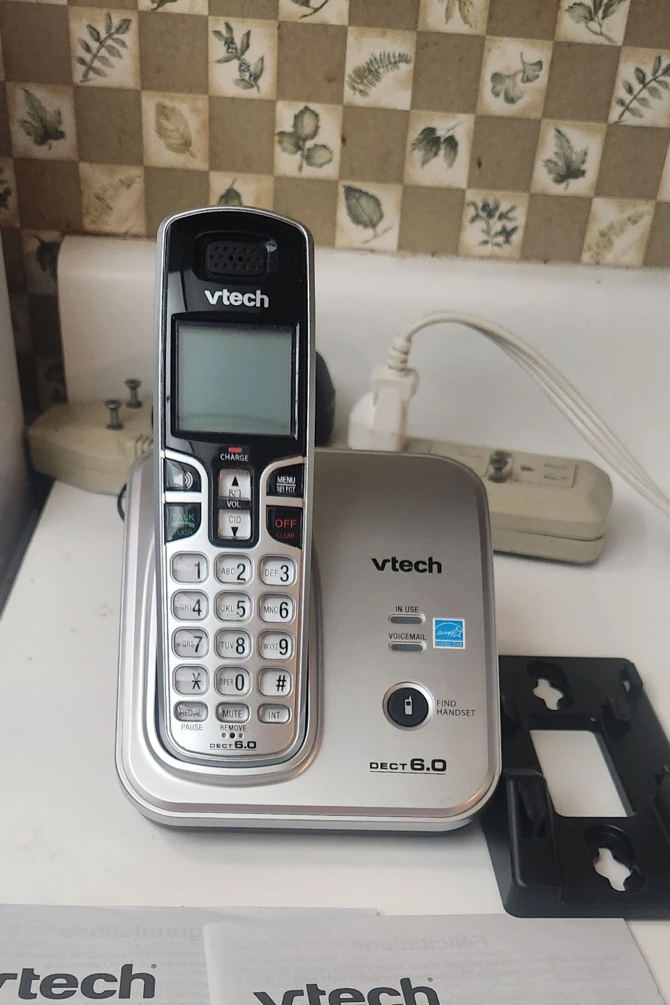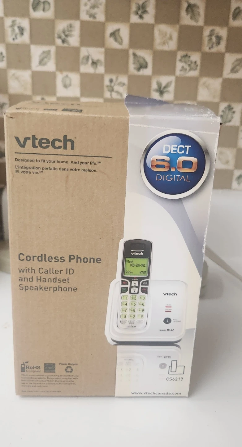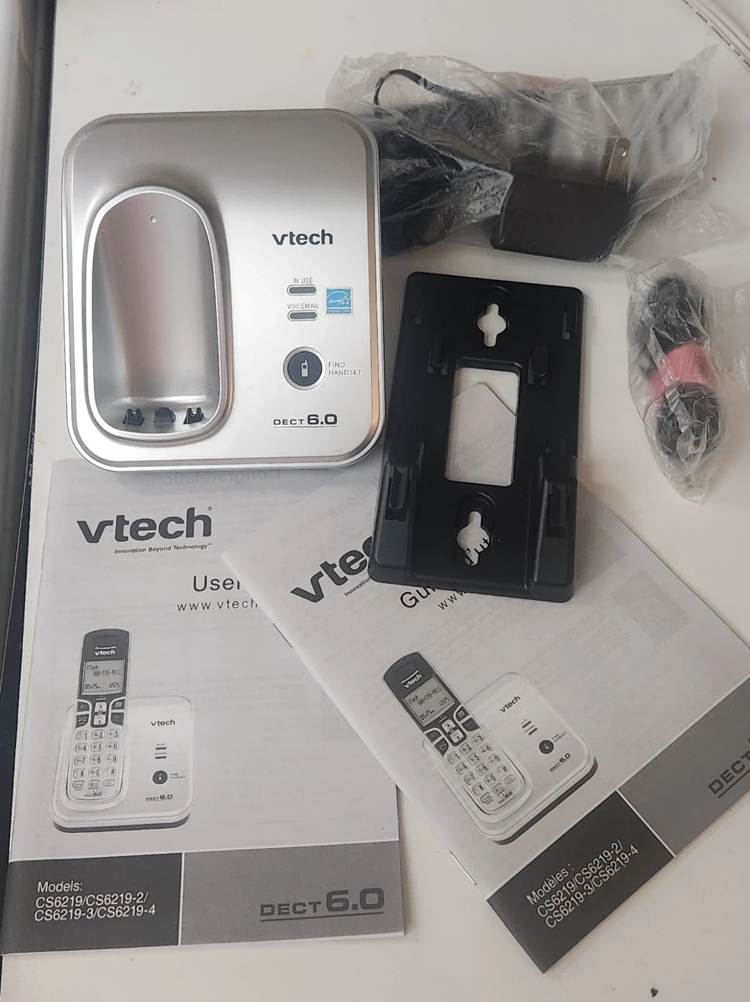Selling a VTech cordless phone, model CS6219. It comes with the base, handset, charger, and all the original manuals. The phone uses DECT 6.0 technology for clear calls and has caller ID and a handset speakerphone. Box is included!