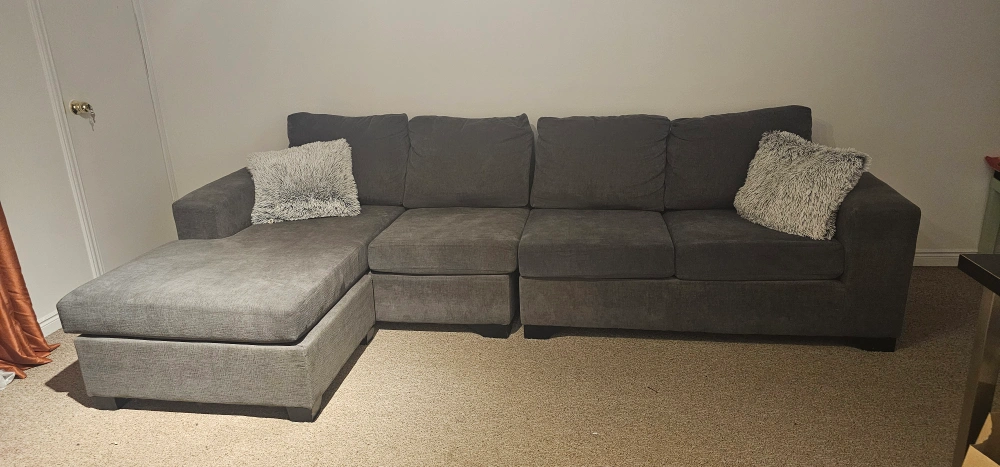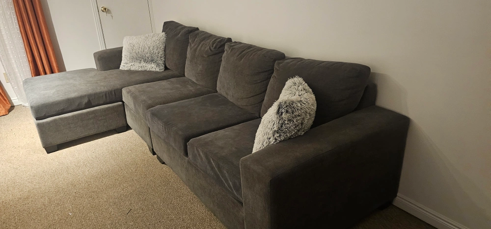 Selling a comfy grey sectional sofa! It's in great shape and features a chaise lounge for extra relaxation. Perfect for a living room or family room setup!