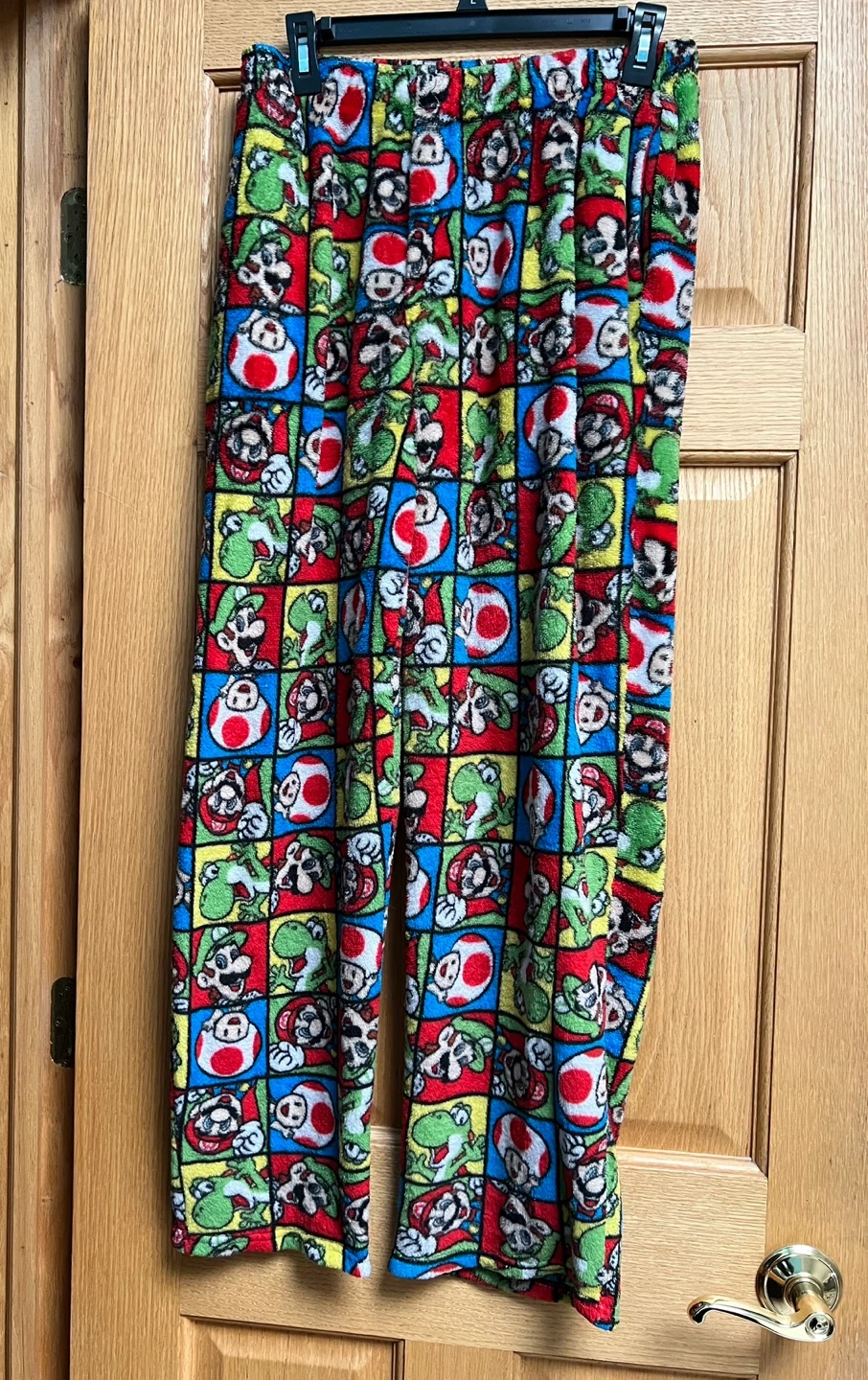 Mens Super Mario pajama pants with an all-over character grid print. Size Medium. Super Soft and Cozy Pj pants. Has a button fly. See picture.