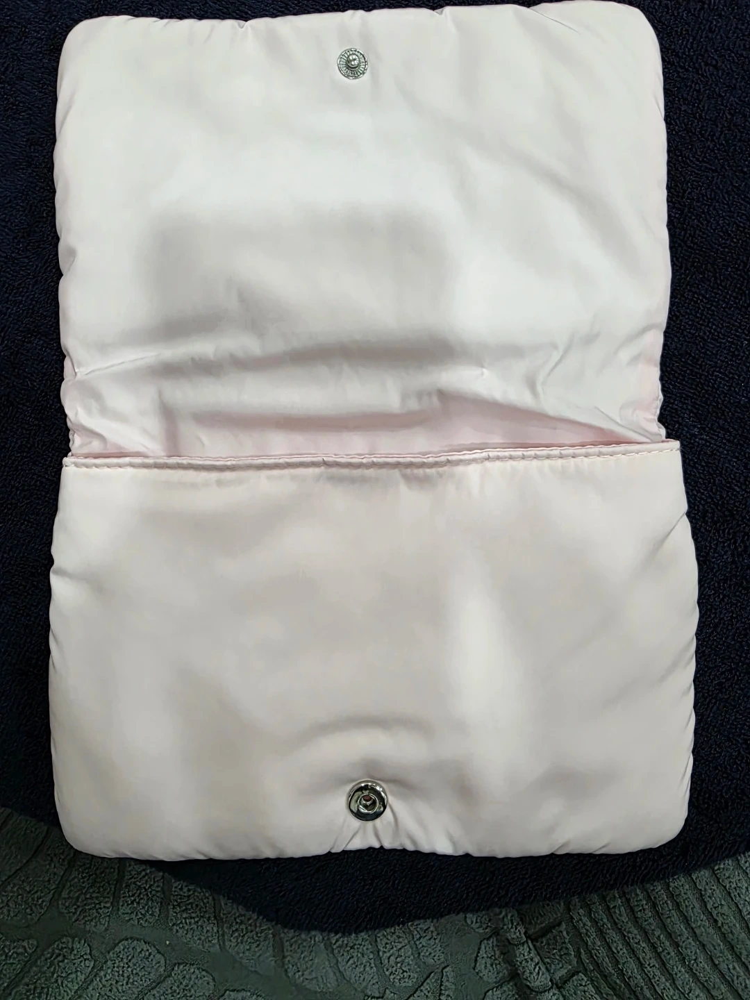 This puffy clutch bag is a soft, light pink color. It has a silver clasp closure. The interior is also lined in a light pink satin. It's ideal for carrying essentials on the go!