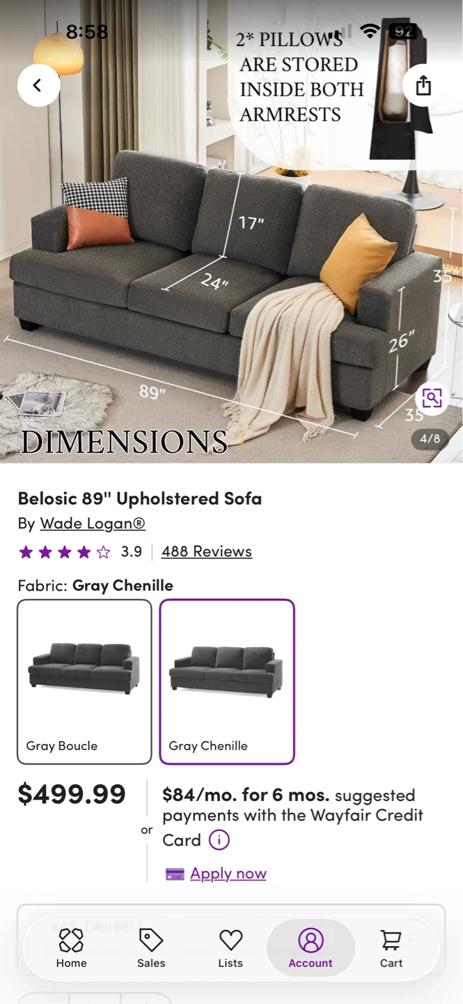 dimensions listed in photo. This is a deep seated couch so it is comfy and suitable for larger person.