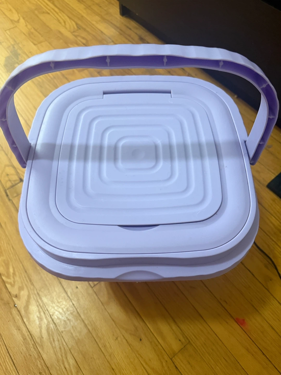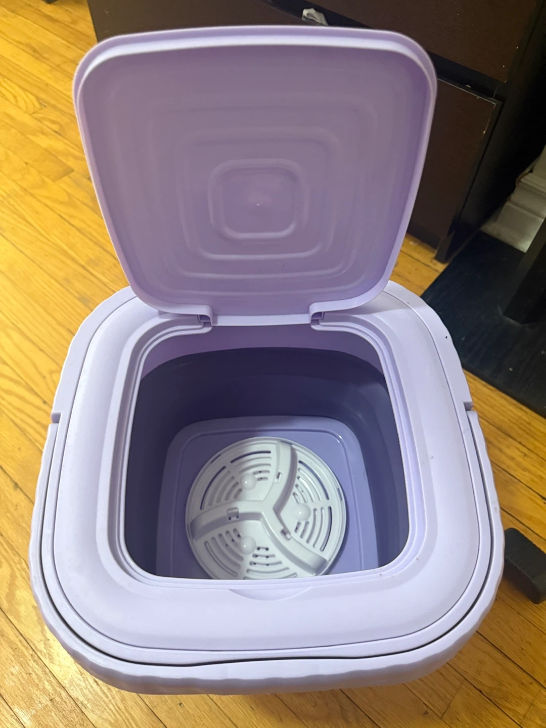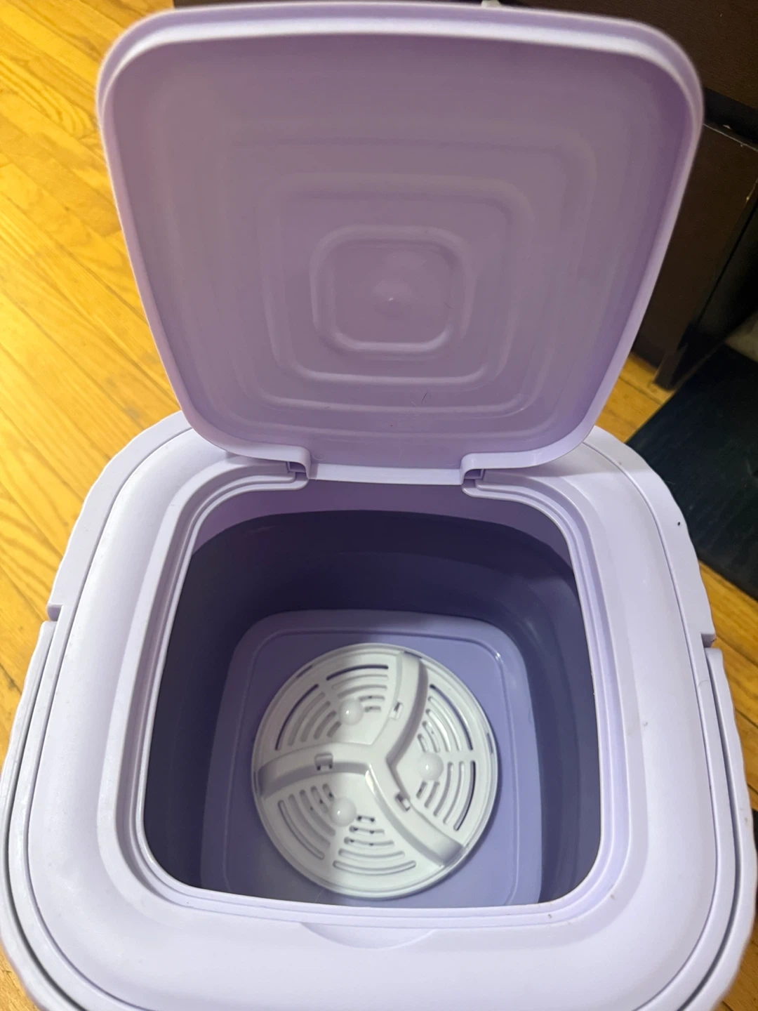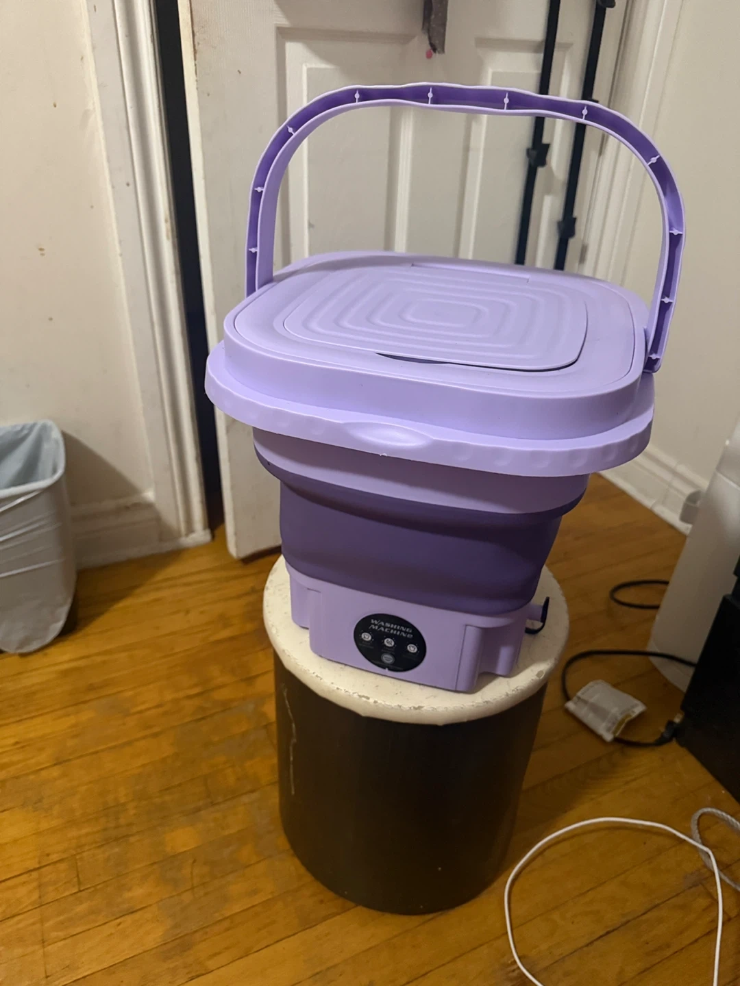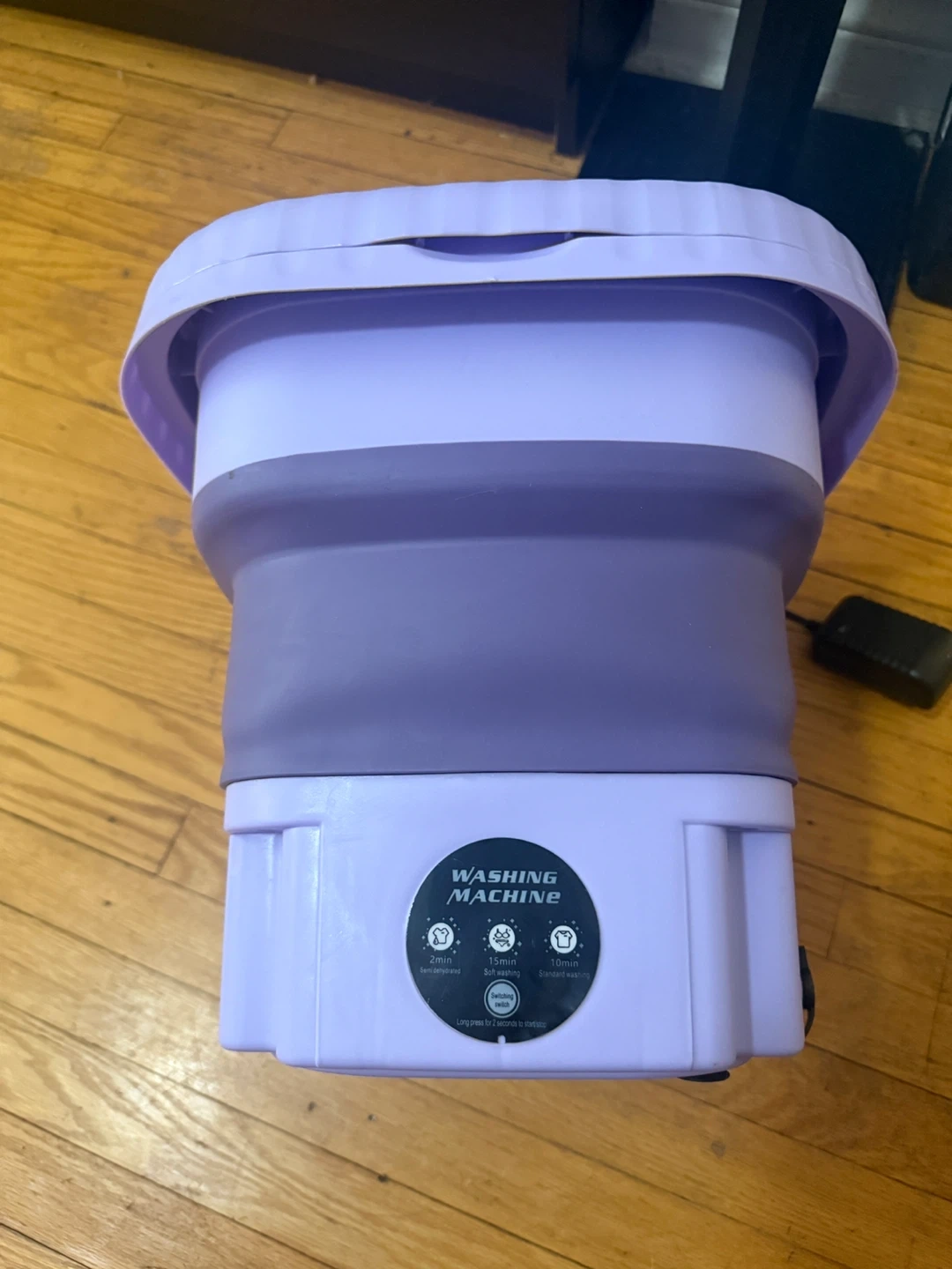 This is a portable folding washing machine. It's purple and collapsible for easy storage. Offers 2min, 5min, and 10min wash cycles. Great for small loads or travel!