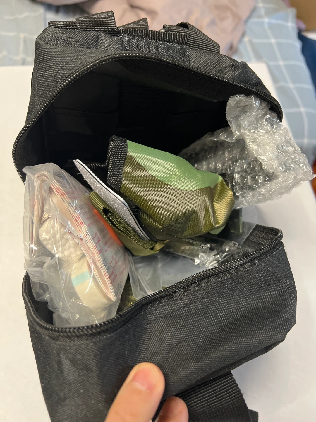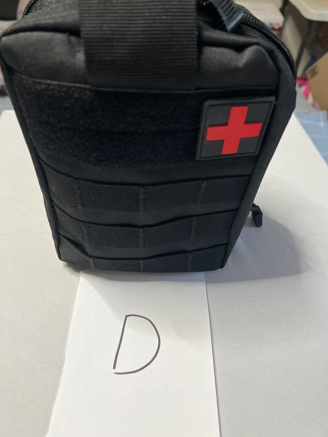 This is a black IFAK pouch, suitable for first-aid supplies. It features a red cross patch on the front. The pouch is made of durable material and includes various medical items inside. It's compact and portable for easy carrying.