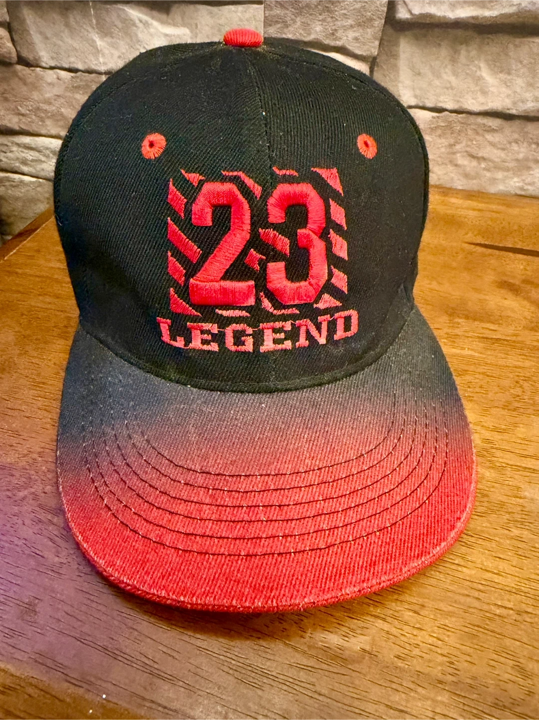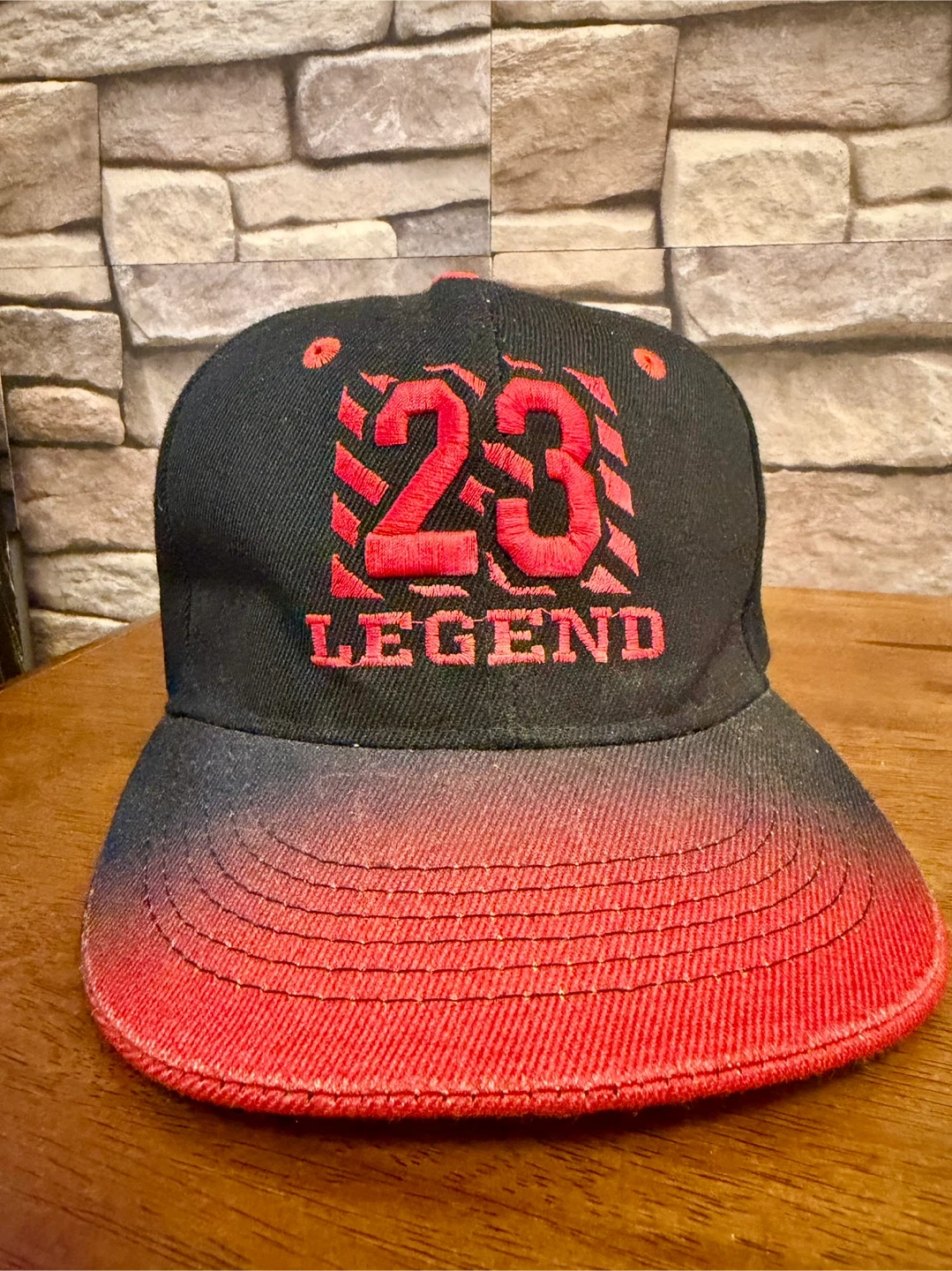 This is a black and red baseball cap with "23 LEGEND" embroidered on the front. The brim features a red gradient design. It's a stylish cap for fans.