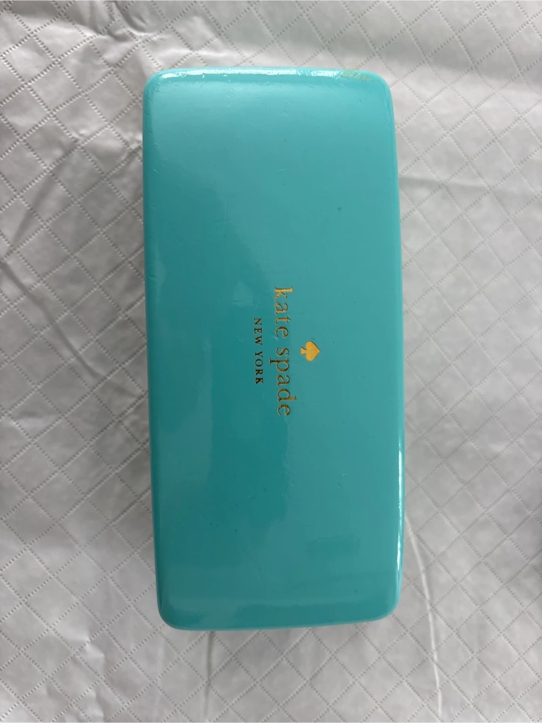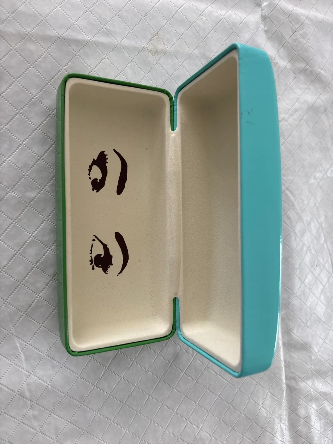 Hard shell eyeglass case from Kate Spade New York. Features a bright teal exterior and a fun face graphic inside. It's perfect for keeping your glasses safe!