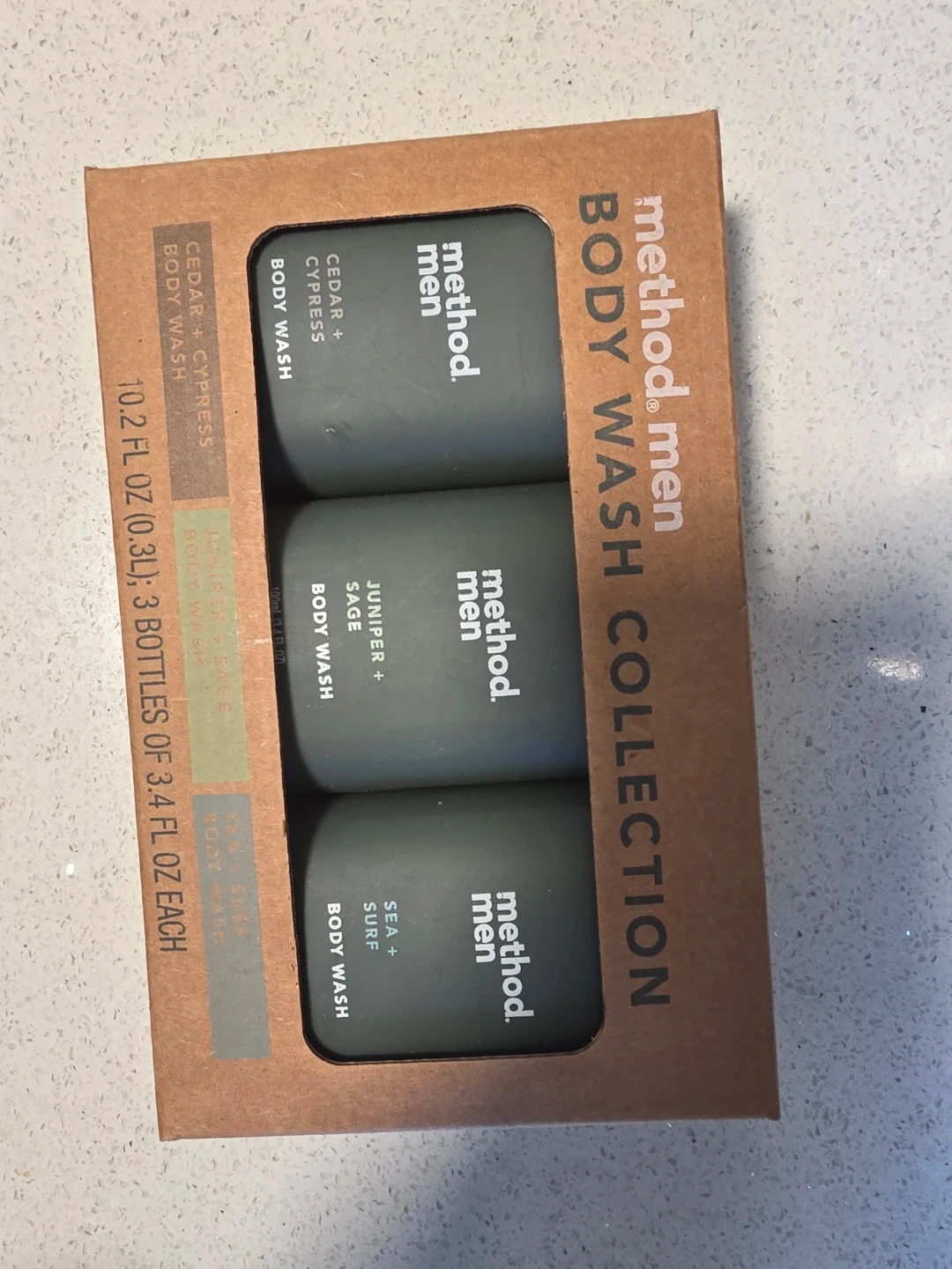Method Men Body Wash Collection brings plant-based cleansers and nature-inspired fragrances. This set includes three 3.4 fl oz bottles: Cedar + Cypress, Juniper + Sage, and Sea + Surf. It's great for trying out different scents.