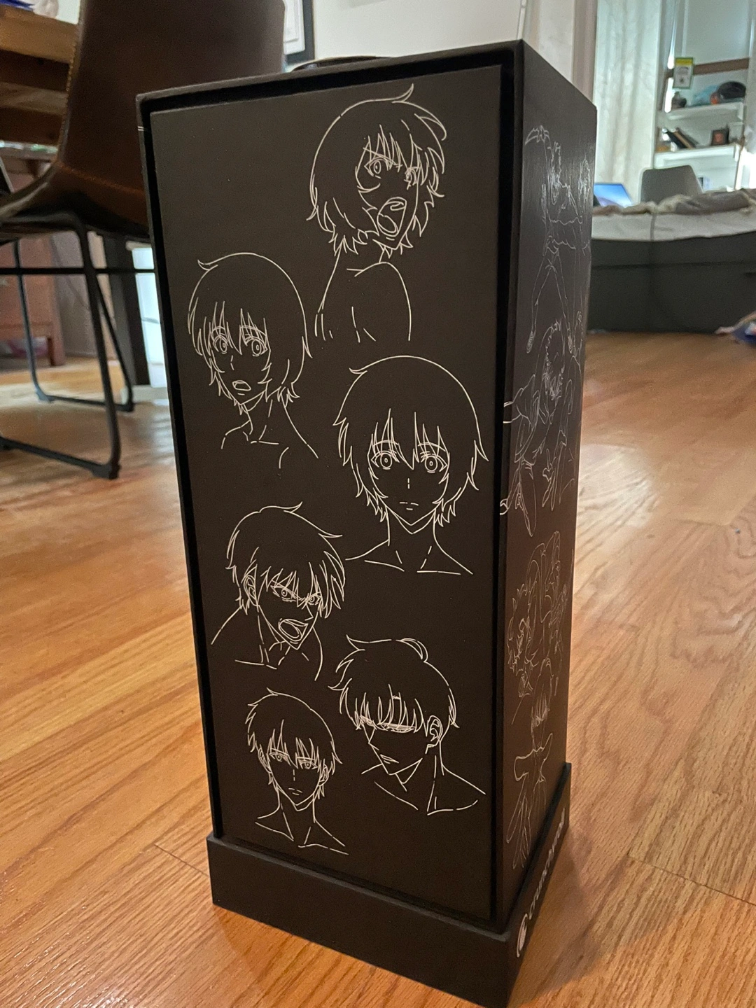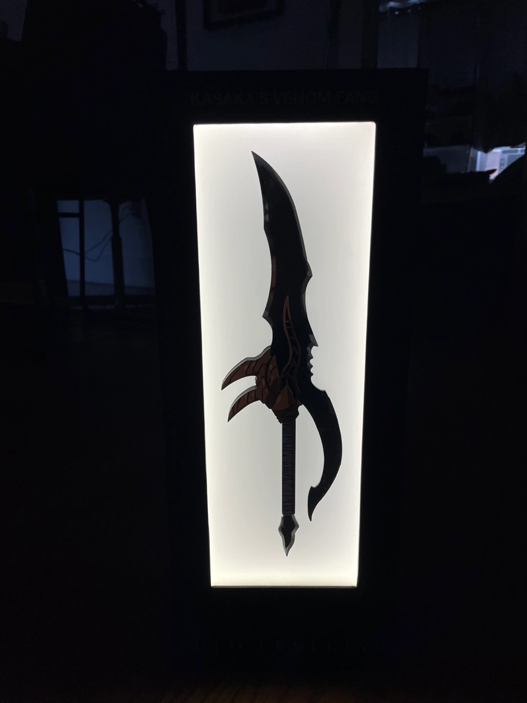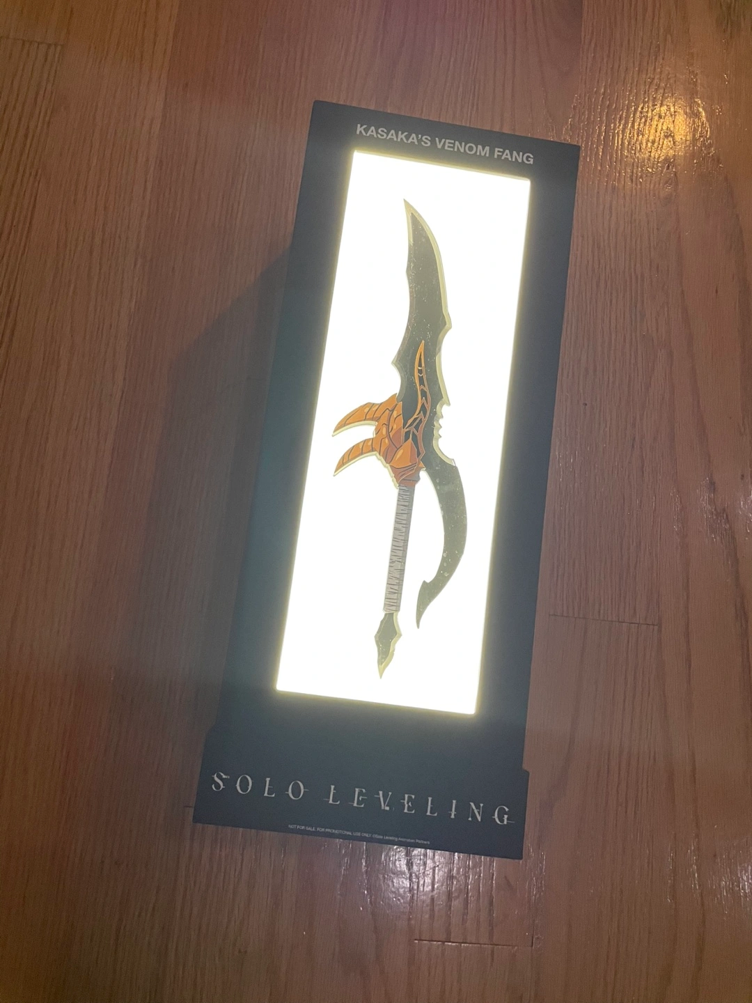 This is a replica of Kasaka’s Venom Fang from Solo Leveling! It’s a limited edition collectible from Crunchyroll, with designs of the characters on the side, a space to store manga in the back… And it lights up!