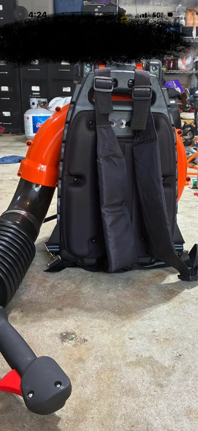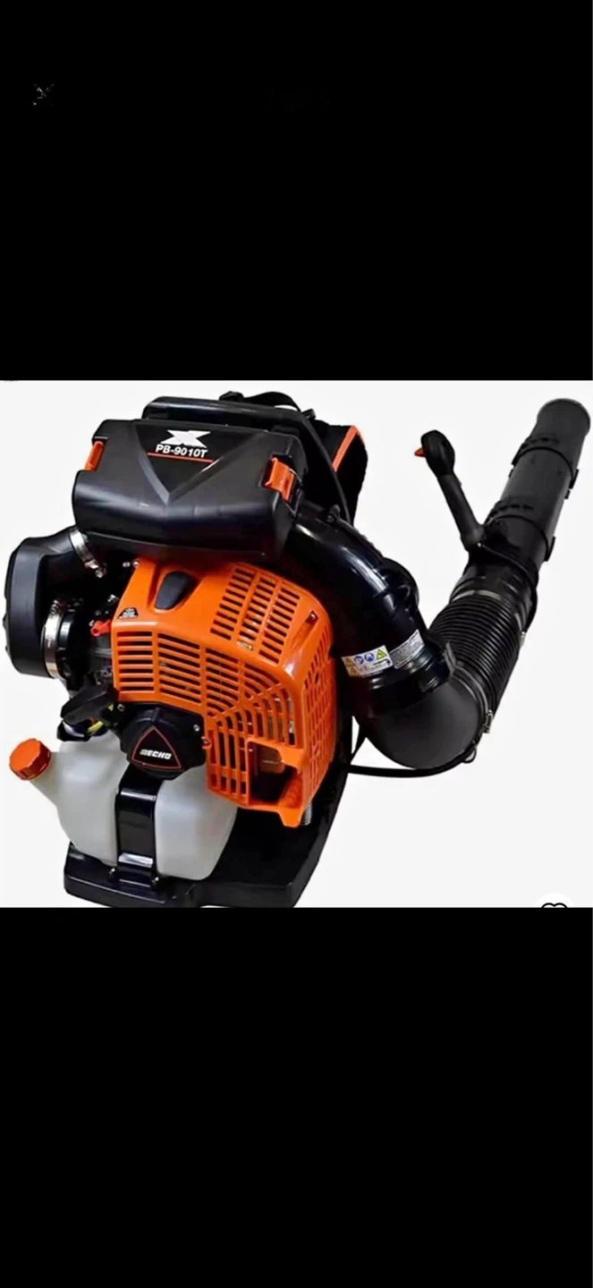 This is an Echo PB-9010T backpack blower. It features a powerful engine and comfortable harness for extended use. Orange and black color scheme.