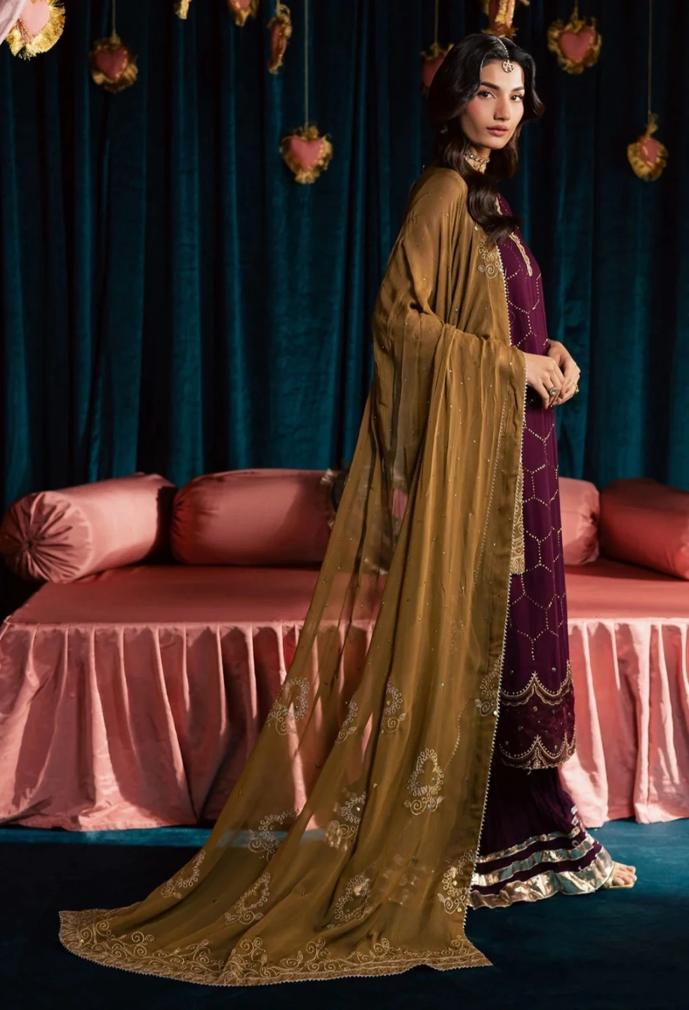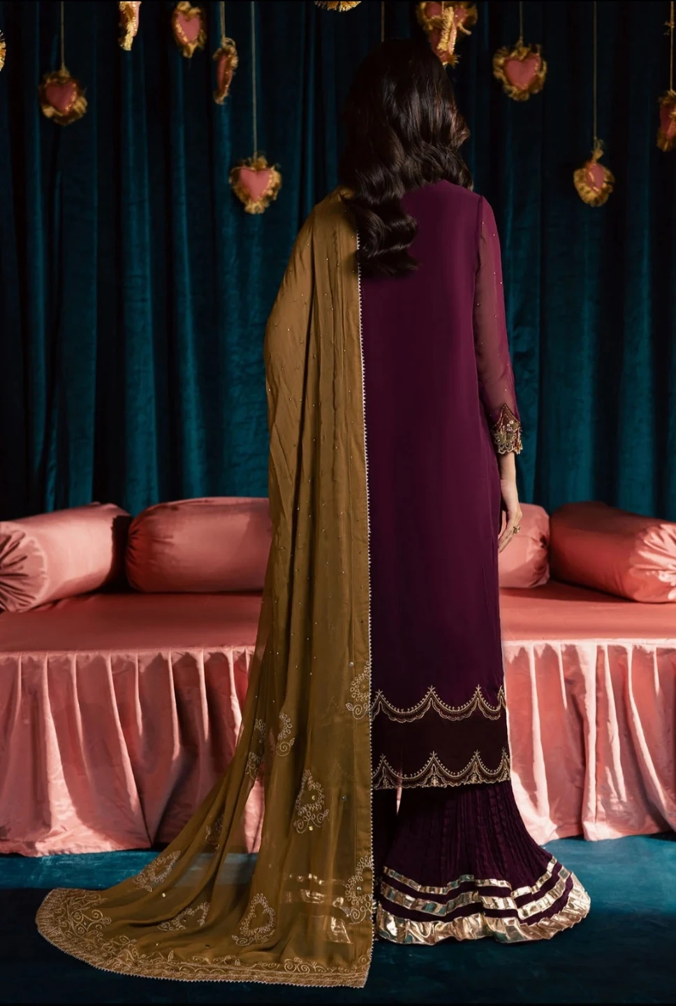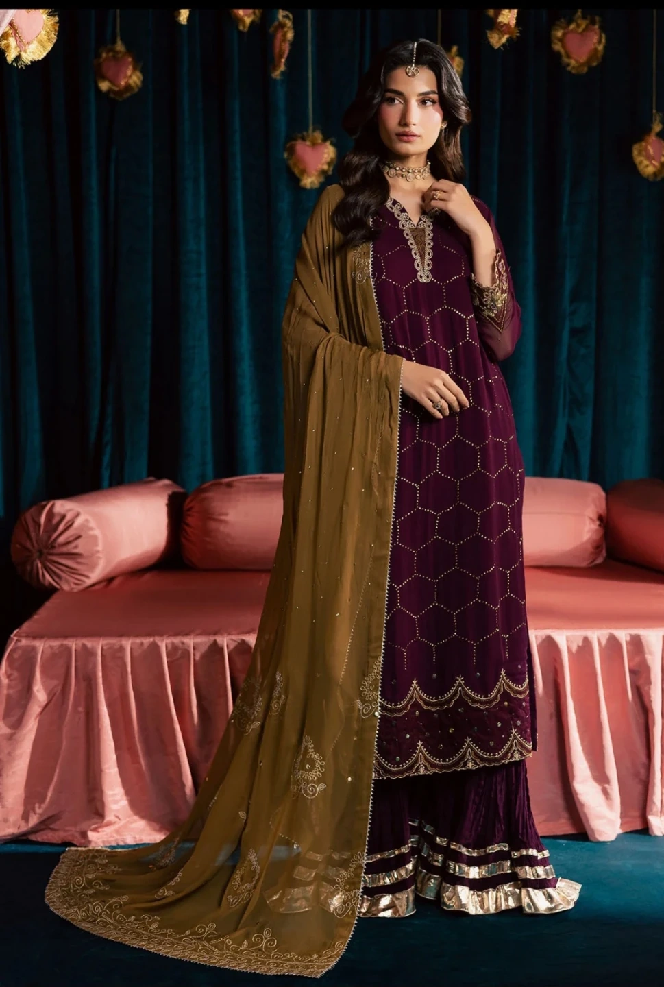 Three-piece unstitched suit. Burgundy kameez with gold embroidery and scalloped hem. Includes matching dupatta and velvet gharara pants with gold trim. Perfect for formal occasions!