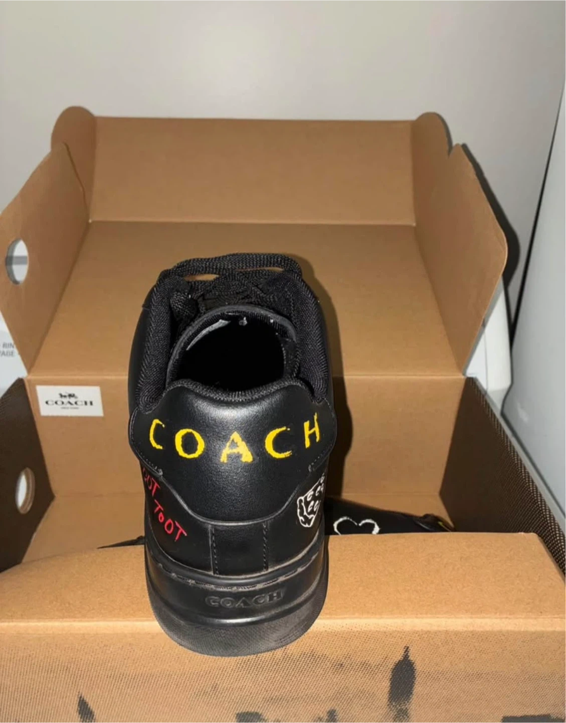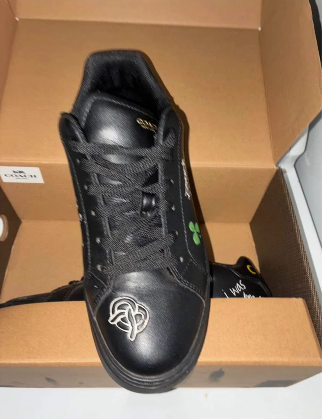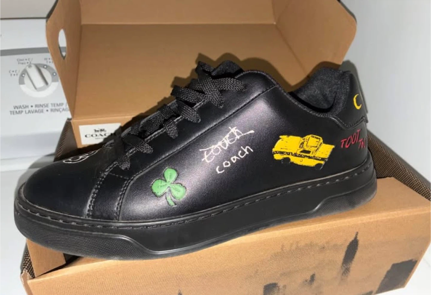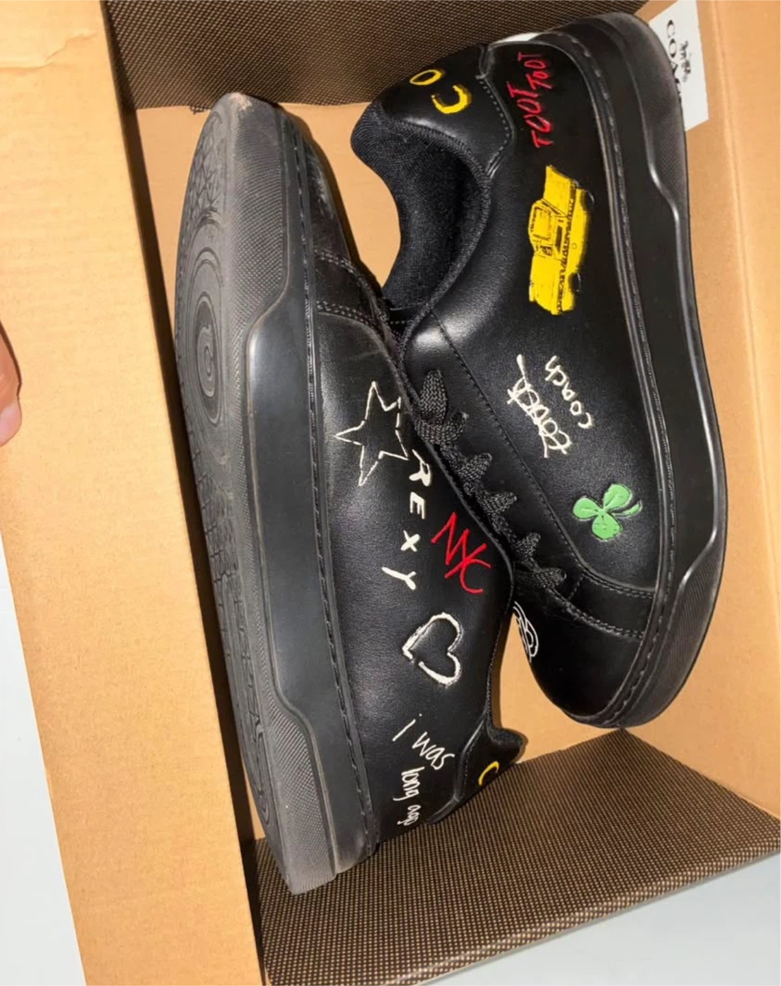 These are black leather Coach High Line Skitch sneakers. They feature playful graphics like a yellow taxi and a clover. Includes original box. Size is 10 D.