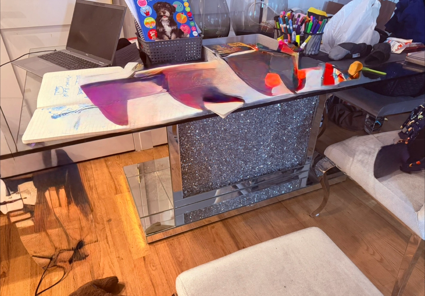 This stylish table features a clear glass top with a striking crystal embellished base. The mirrored trim adds a touch of elegance. It's a perfect statement piece for any modern living space. Measures approximately 47 inches wide by 28 inches deep by 30 inches tall. The base does have cracks