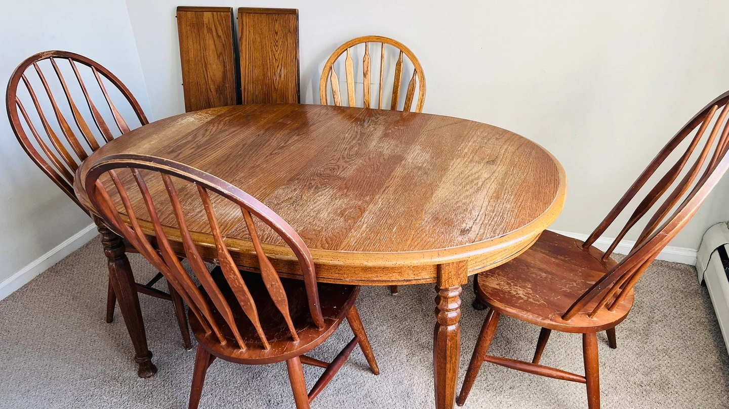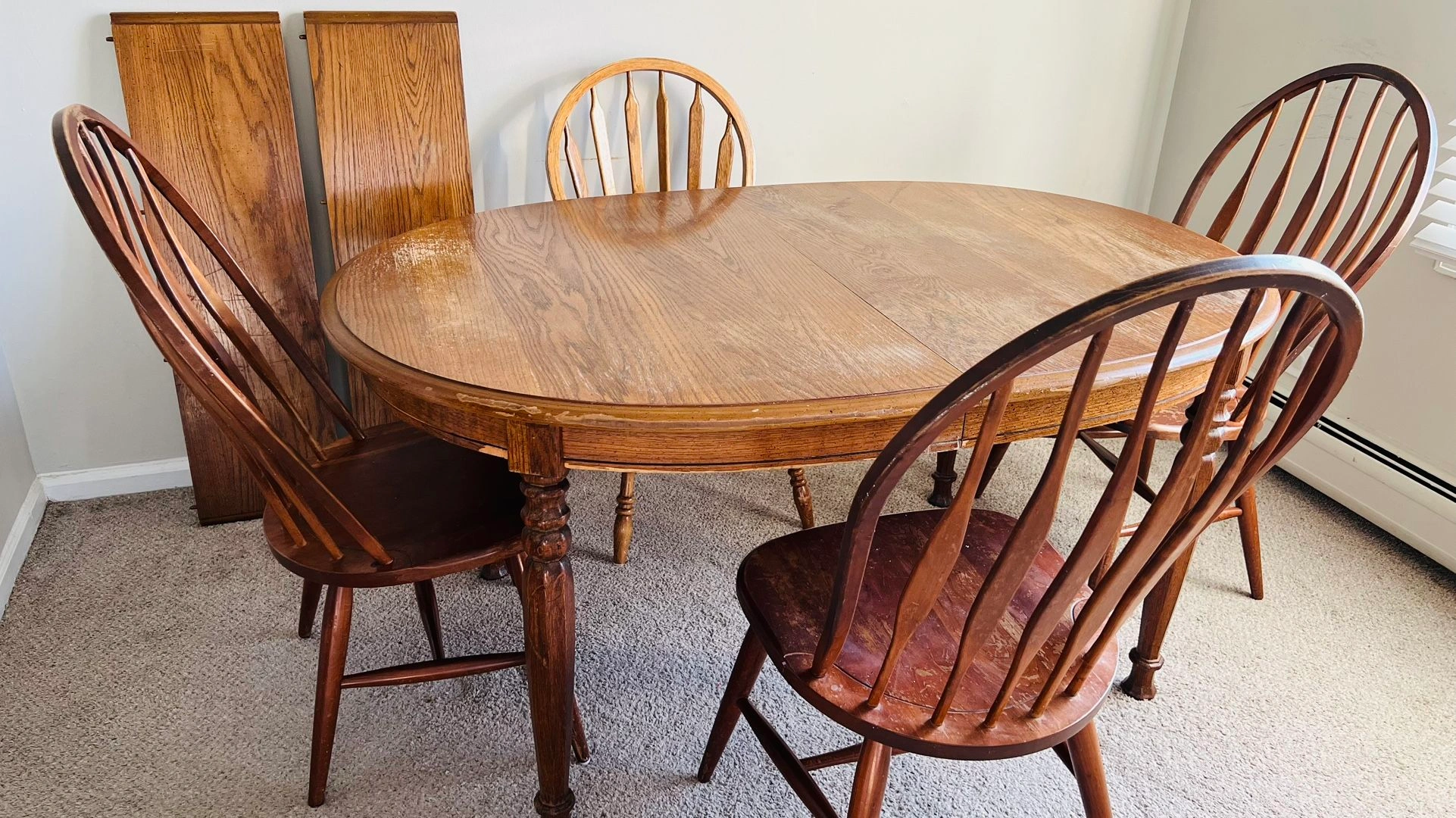Oval wooden dining table with four chairs and two extension leaves. Solid wood table in good shape with some minor scratches. Table 60" long, 2 leaves each 12”, 42” wide. Move out sale, everything must go. Please check other items as well.