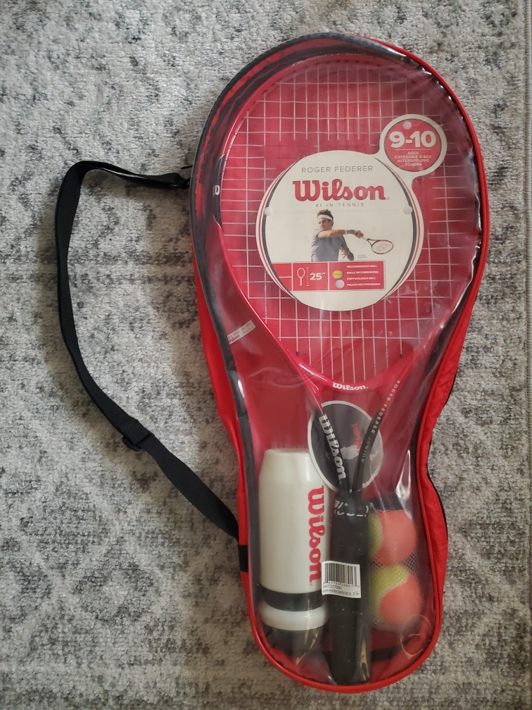 New Wilson tennis racquet set. Includes racquet, carrying case, three tennis balls, and water bottle. Great for kids!